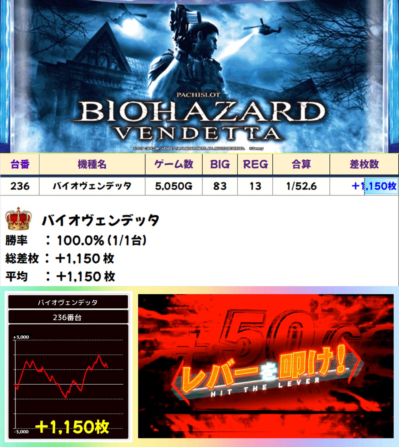 ⑥のつく日は毎回最高設定の挙動を見せる「バイオヴェンデッタ」が鉄板! 本日は中盤でマイナス域に入る展開でしたが、最終的には+1,150枚でフィニッシュ! 「バイオヴェンデッタ」はこれで⑥のつく日3連勝となりました!