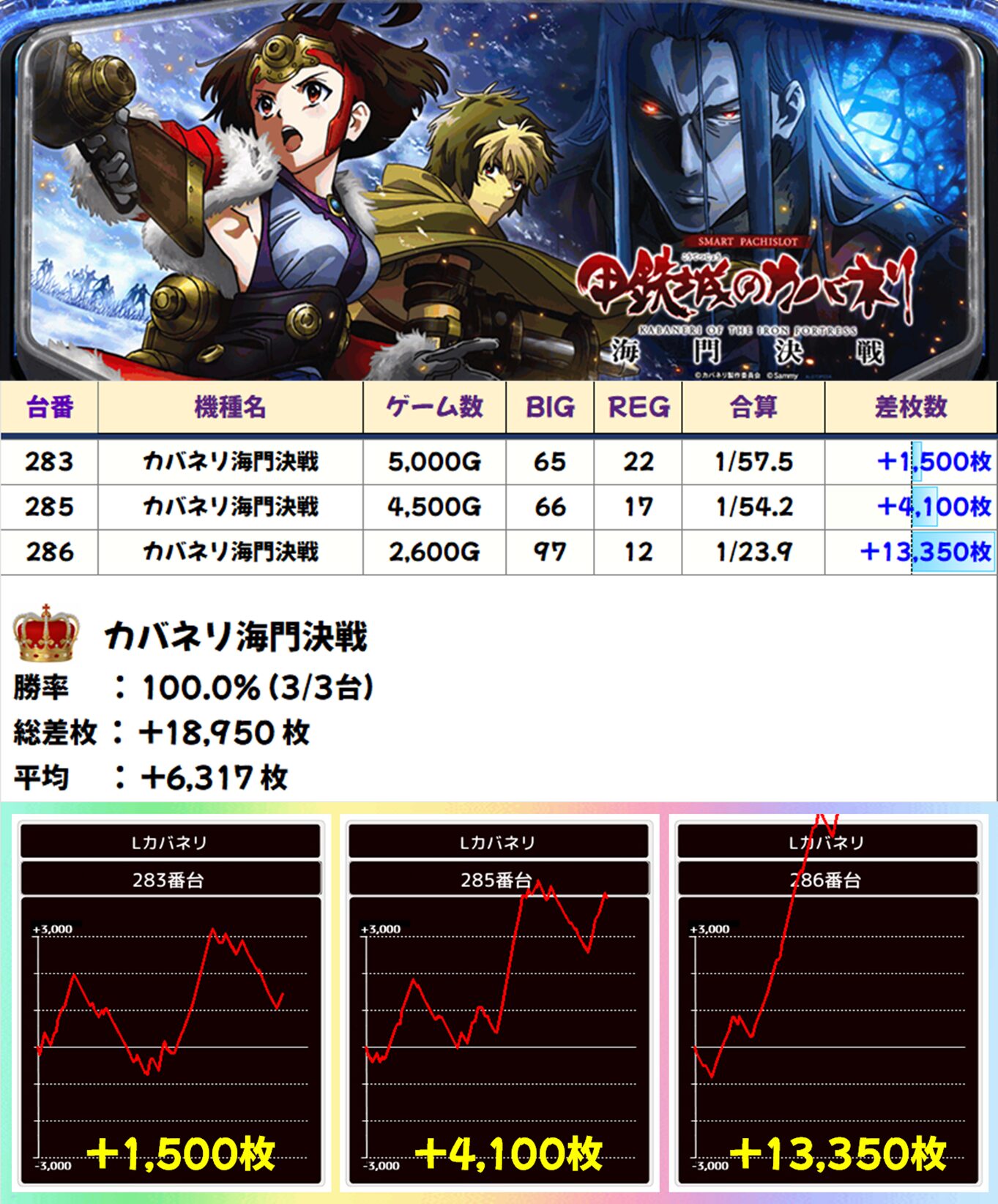 3台設置の大人気機種「カバネリ海門決戦」が全台系濃厚。結果は平均差枚+6,317枚で全台がプラス差枚。+13,350枚、+4,100枚と大爆発台も複数出現しました。