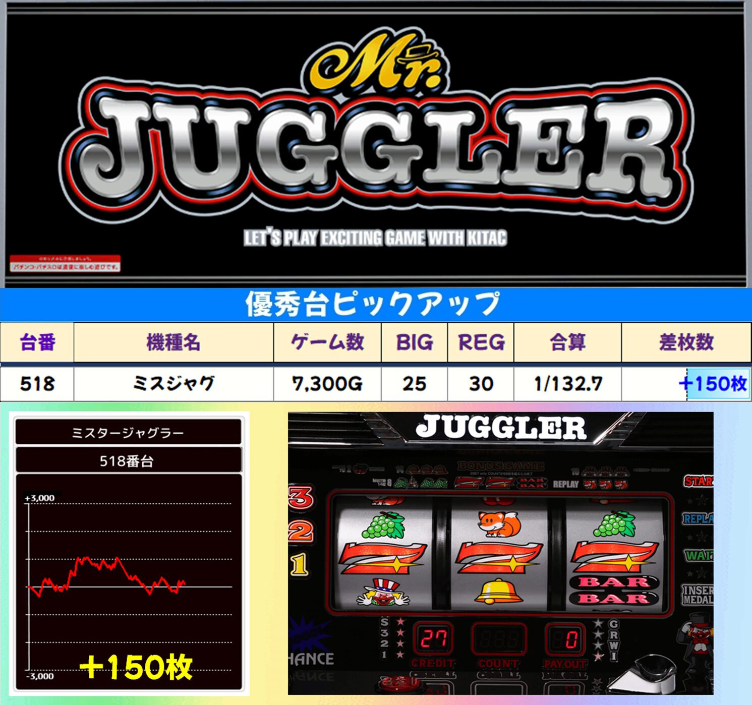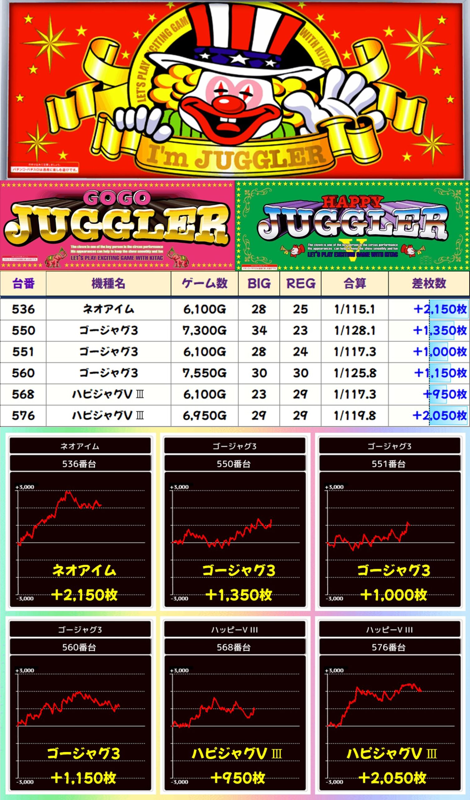 ⑥のつく日は多台数設置のメイン機種からジャグラーまで狙いドコロ満載! 本日も爆発台&優秀台が多数出現しそうですね!