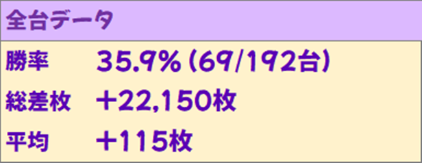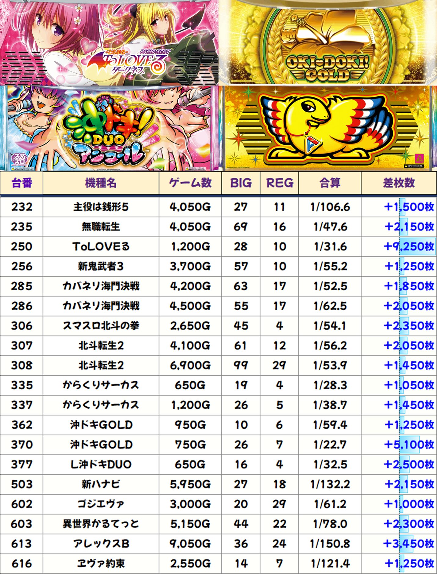 本日の結果は総差枚+22,150枚、平均差枚+115枚の好成績! +11,550枚を筆頭に+5,000枚オーバーが8台と大爆発台も多数出現しました。