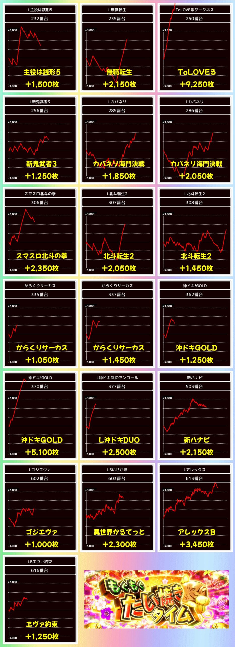 ⑥のつく日は単品も盛りだくさん。本日は「ToLOVEるダークネス」から+9,250枚、「沖ドキGOLD」から+5,100枚、「アレックスB」から+3,450枚と単品からも大量出玉獲得台が複数出現! ⑥のつく日はどこを狙ってもチャンスがありますね。