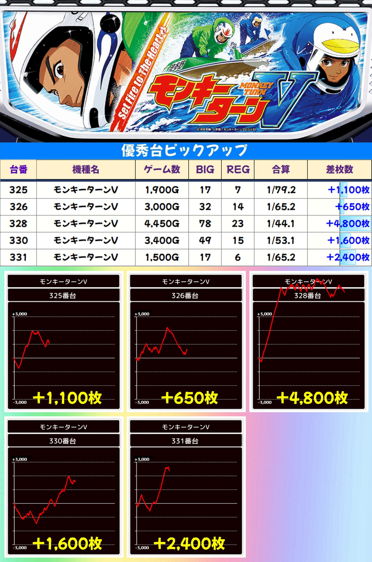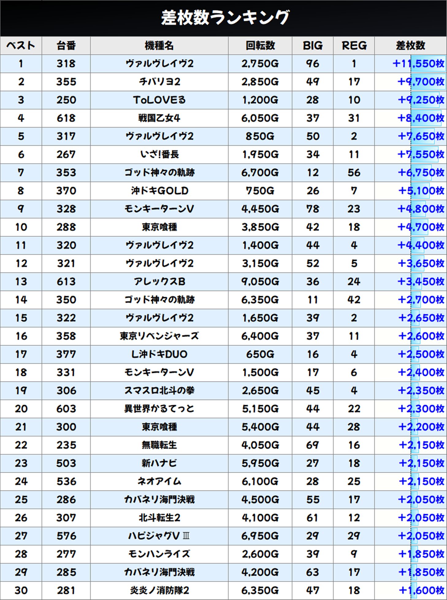 「ヴァルヴレイヴ2」の結果は総差枚+29,500枚、平均差枚+6,317枚で5台がプラス差枚。+11,550枚、+4,400枚、+3,650枚と大爆発台も複数出現しました。高配分の「モンキーターンV」「ゴッド神々の軌跡」にも爆発台が複数! 次回の⑥のつく日もメイン機種が狙い目ですよ。