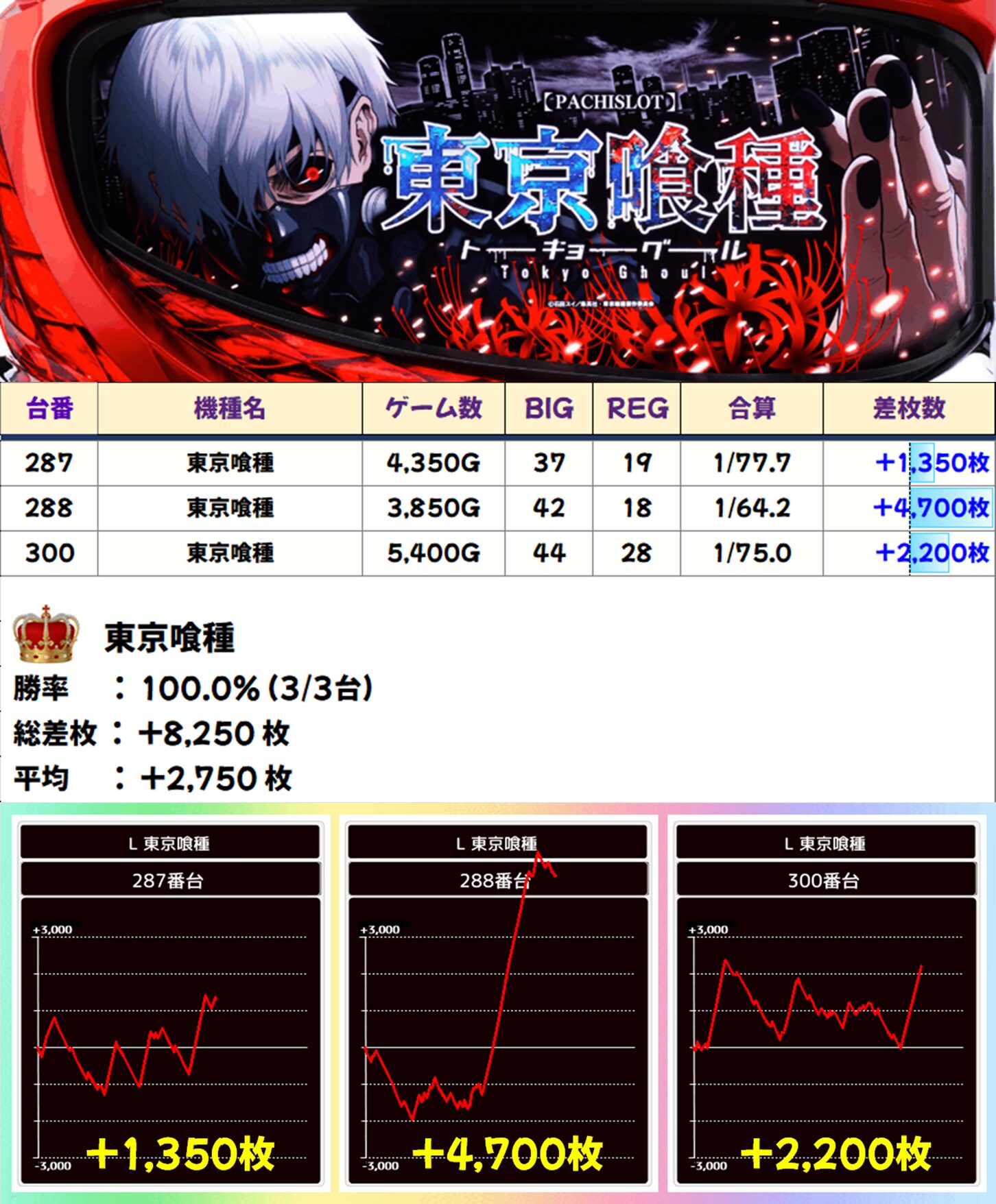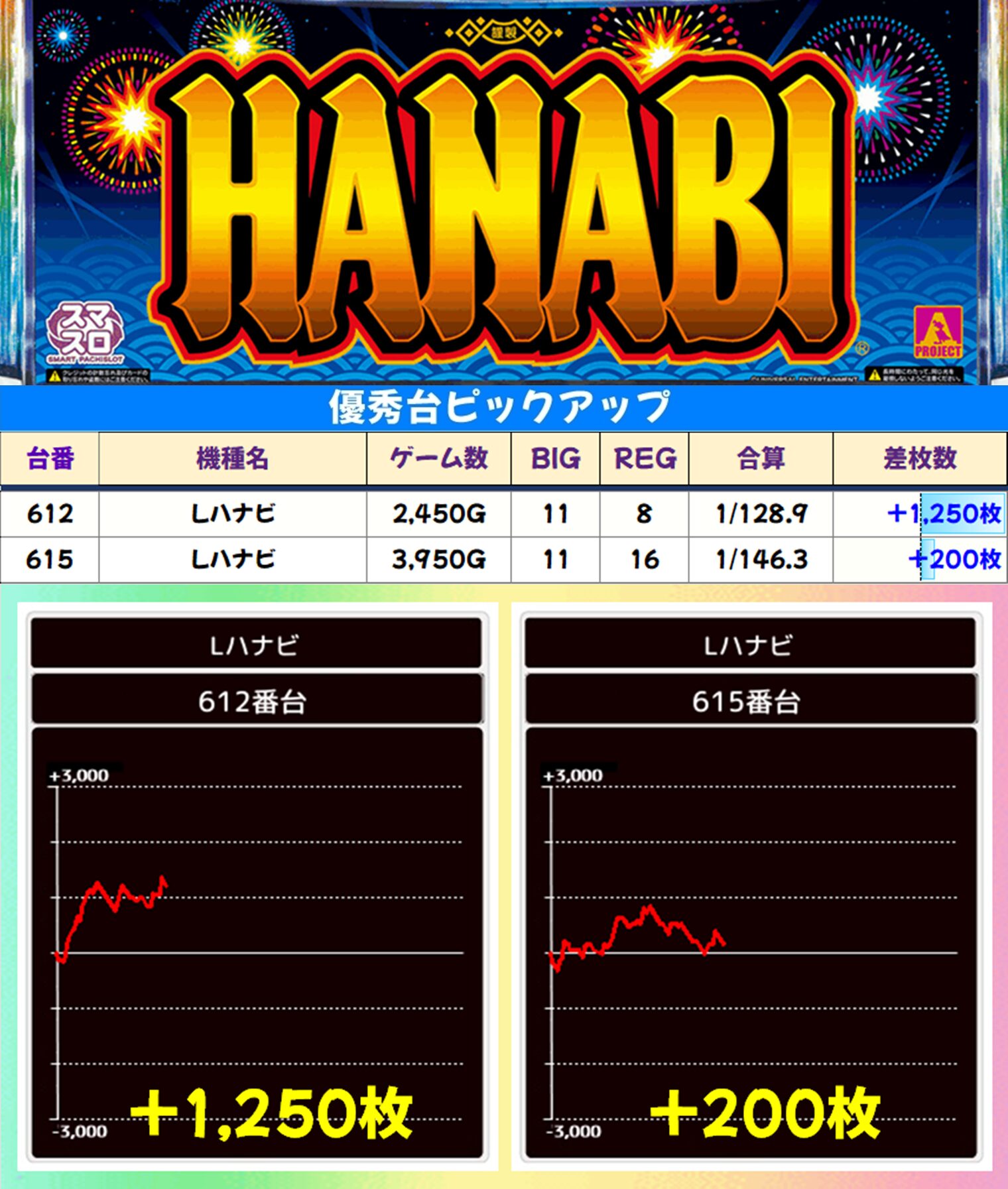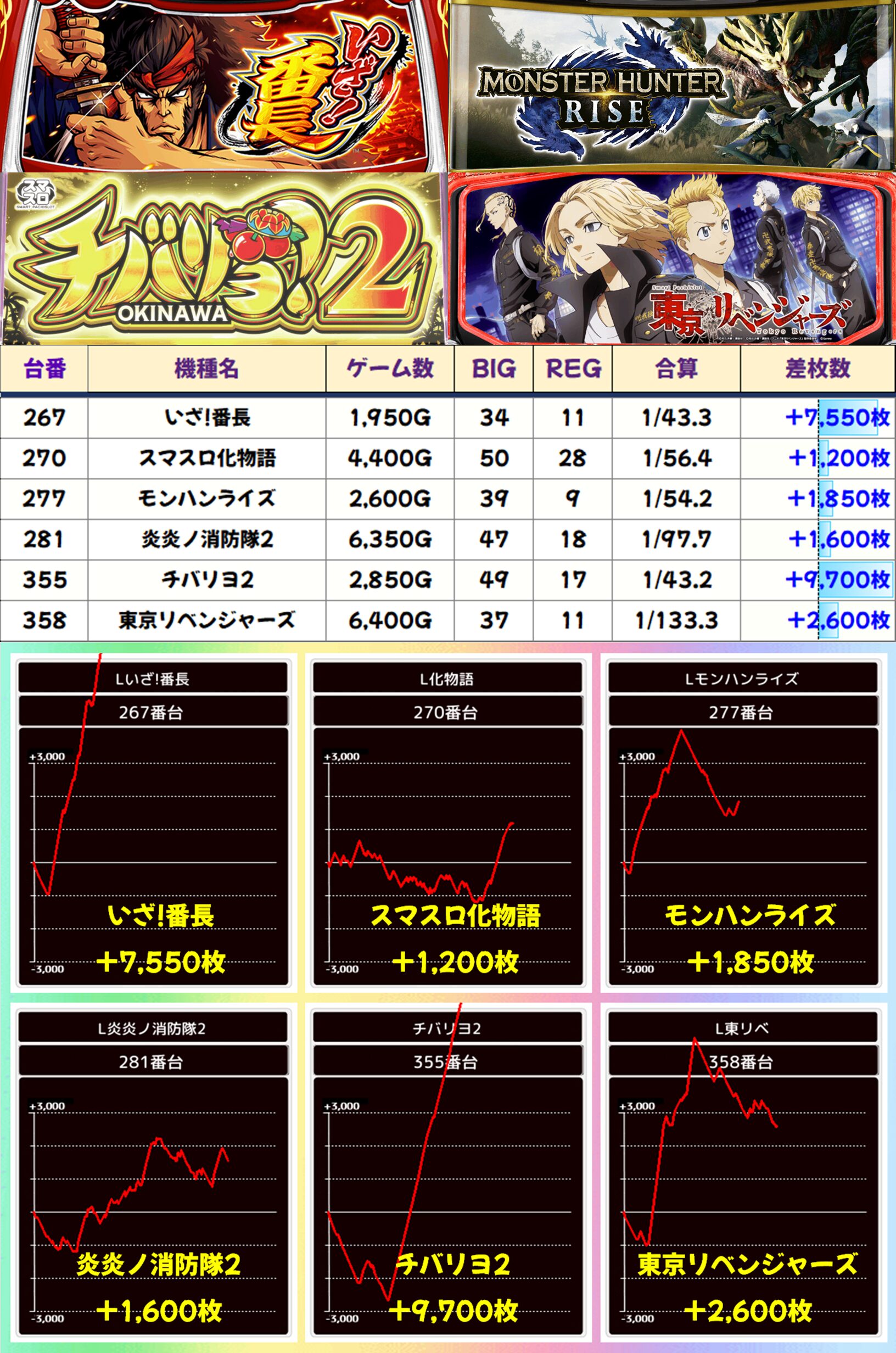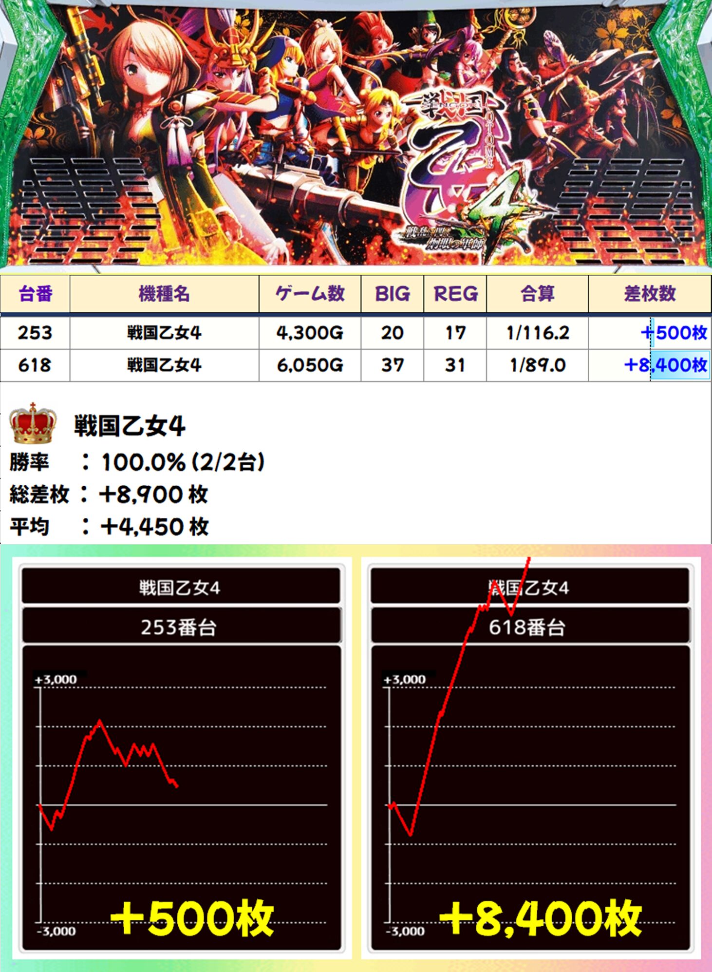 本日は「戦国乙女4」「東京喰種」が全台系濃厚、「Lハナビ」が高配分! 機種イチの仕掛けの「チバリヨ2」から+9,700枚、「いざ!番長」から+7,550枚と少台数設置機種からも大爆発台が複数出現しました。