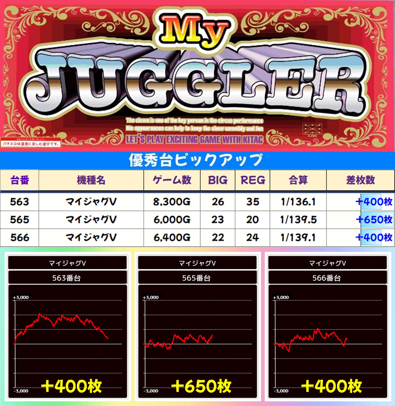 ⑥のつく日に手堅い勝負をするならジャグラーシリーズがオススメ! 本日は「マイジャグV」と「ミスタージャグラー」が高配分、その他のジャグラーにも多数の単品が! ⑥のつく日のジャグラーシリーズは相変わらず高配分仕様ですね。