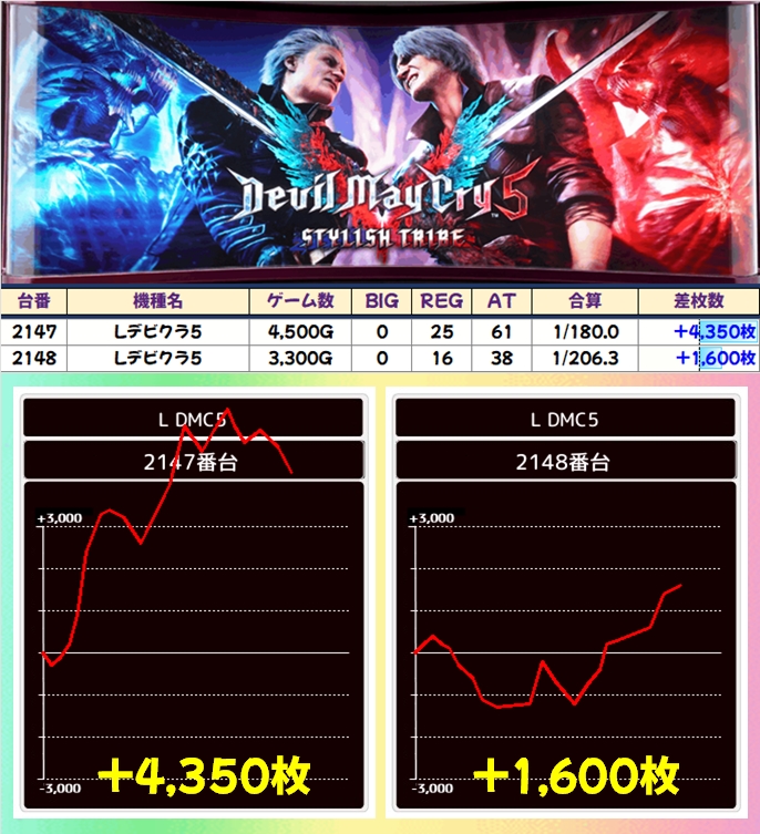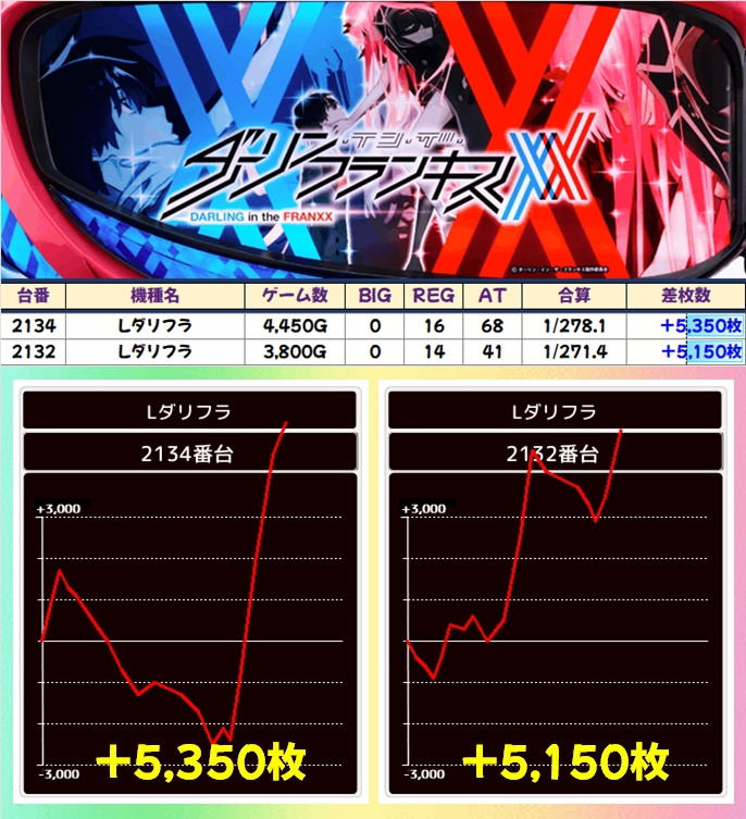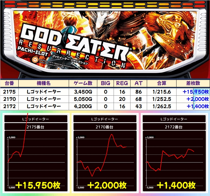 中でも万枚オーバーも飛び出した「ゴッドイーター」&「バイオ5」、6台中3台が+4000枚以上の「吉宗」、4台中2台が+5000枚以上の「ダリフラ」などが、特に目立っていました!
