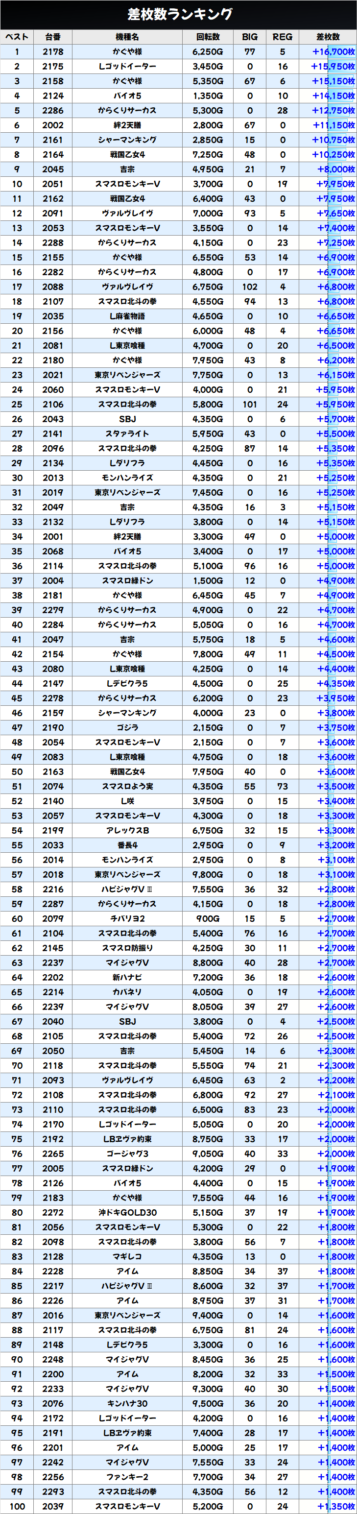 +15000枚以上×2台を筆頭に11台中7台と大量の台が+4500枚を上回り、総差枚+4.6万枚超を達成!