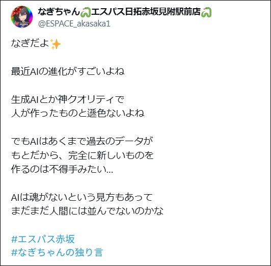 公式Xでは「なぎちゃんの独り言」もしっかり発動。公式Xのお知らせは大体20時に、そこから30分後に独り言がポストされる傾向にあるので、しっかりチェックしておきましょう。