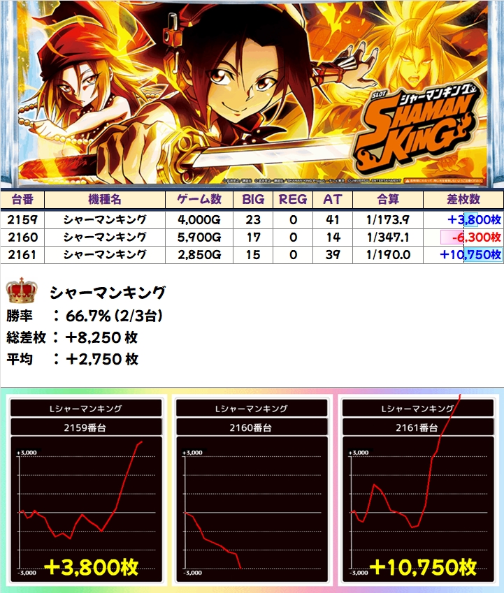 「シャーマンキング」からは万枚が爆誕!「アレックスB」も+3300枚、+1100枚と全2台が好結果!