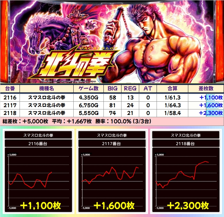 スマスロ北斗の拳(16/27台+)➡平均+1,074枚