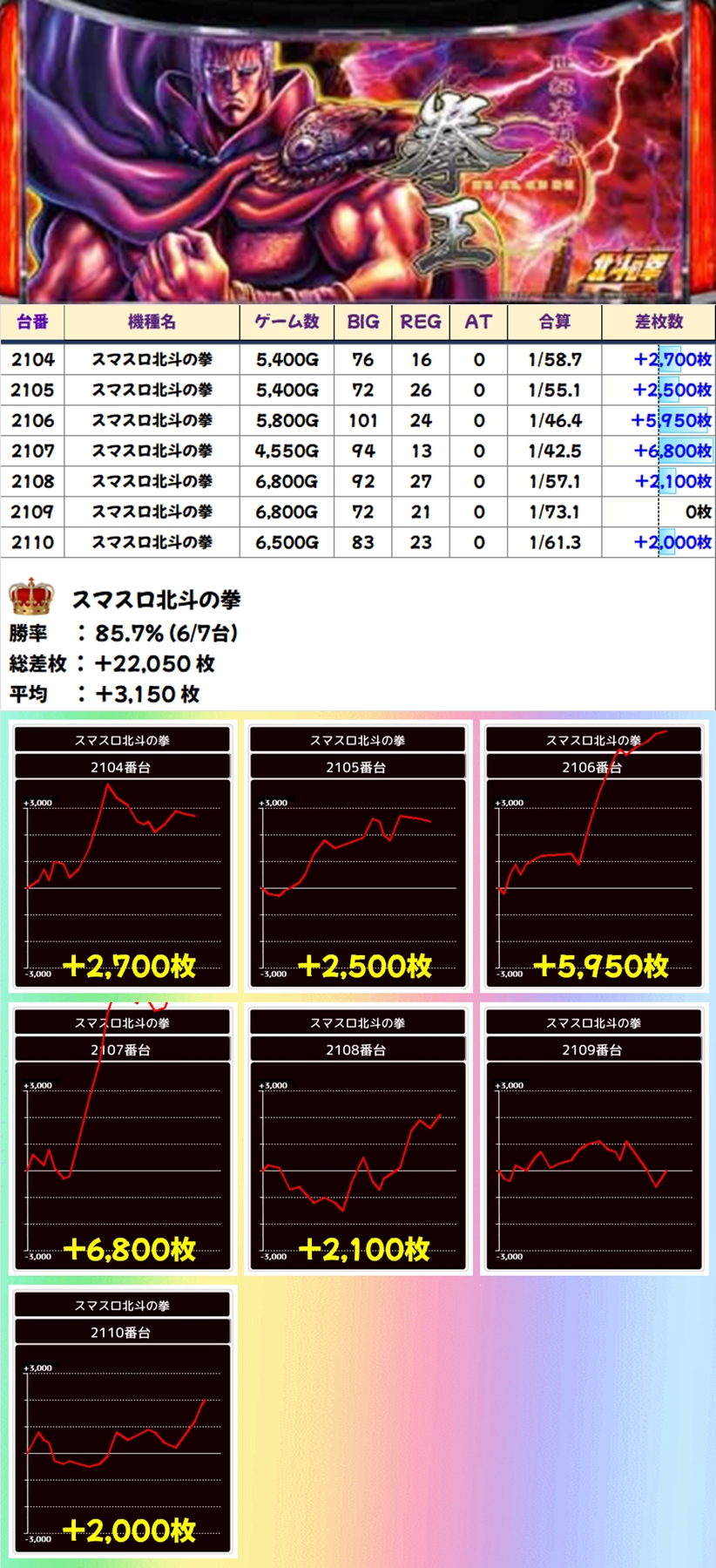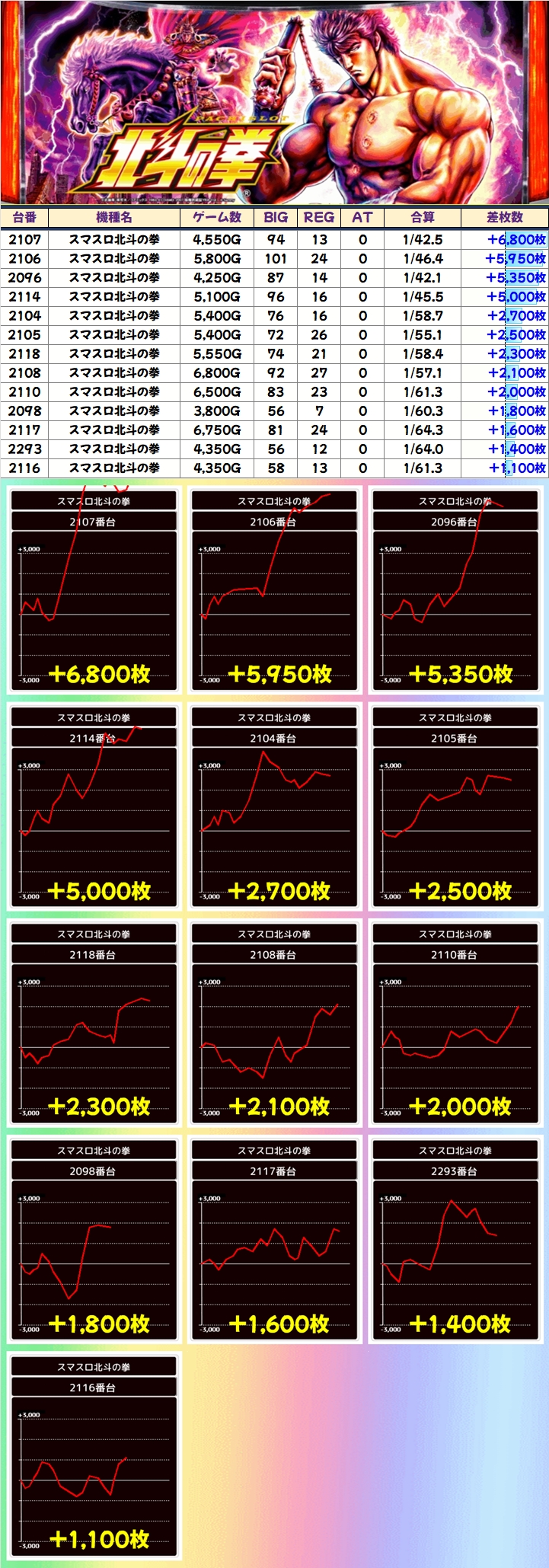 「からくりサーカス」には万枚オーバー、「北斗の拳」には+6000枚クラスが2台、「モンキーV」には+7000枚以上が2台など各機種に優秀台が多数あり、全て平均+3000枚を大きく上回る好結果に!