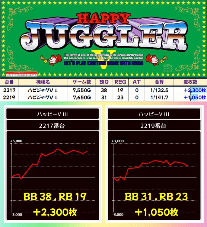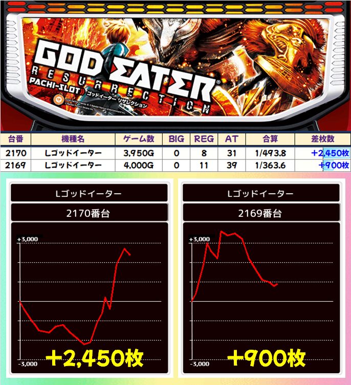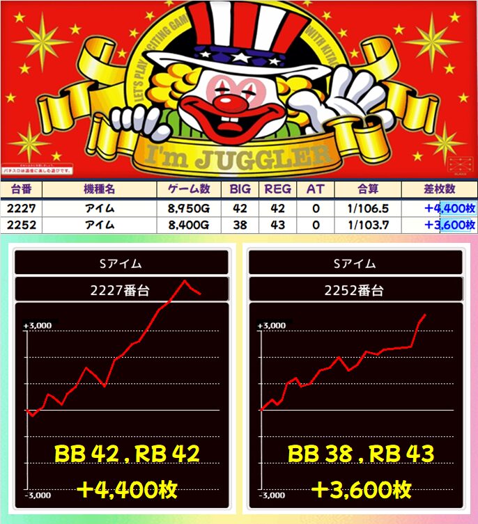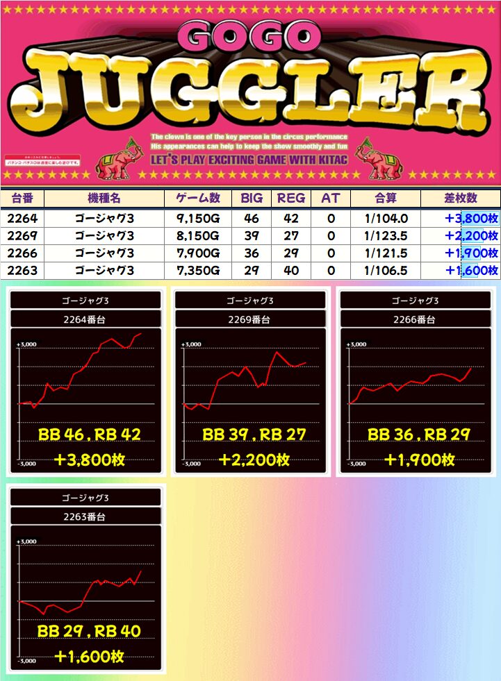 「アイム」は+4000枚クラスが複数、「ゴージャグ」も+3800枚を筆頭に半数以上の4台が+1500枚以上と結果を残しました!