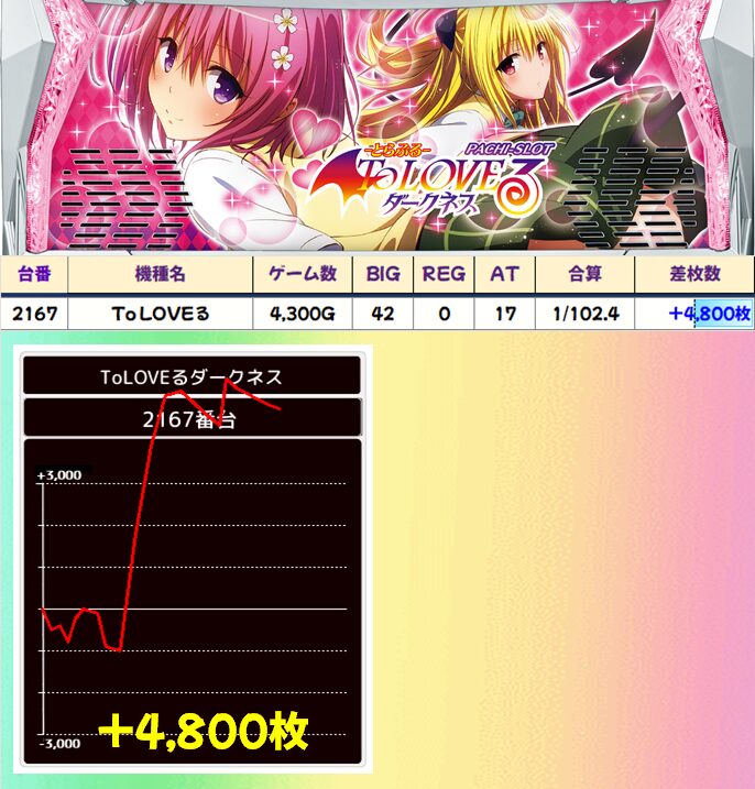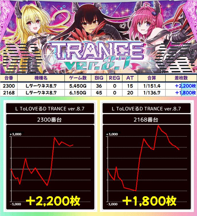 「To LOVEる」からは+5000枚クラス、「Lダークネス8.7」からは3台中2台が+2000枚クラスの優秀台を確認!