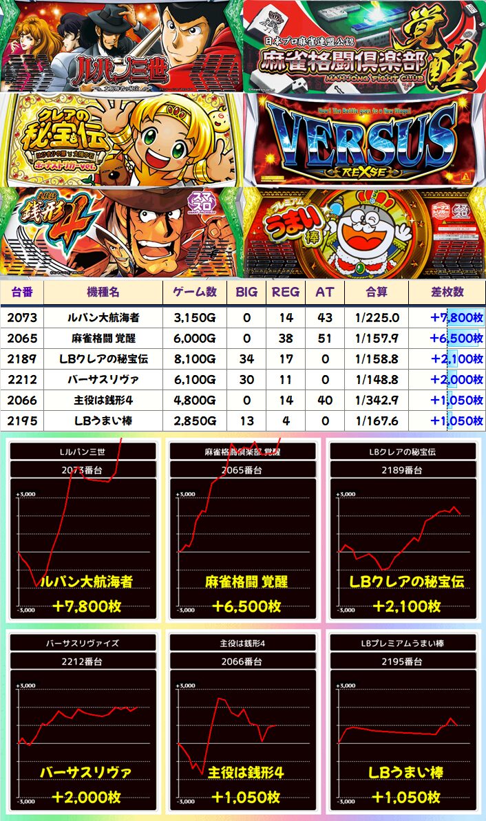 独り言に示唆があったバラエティも「ルパン大航海者」の+7800枚、「麻雀格闘 覚醒」の+6500枚など優秀台が充実!