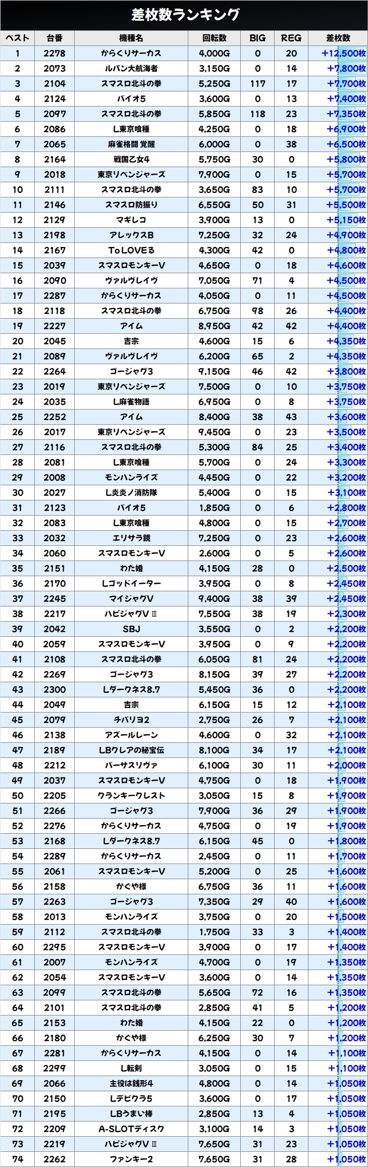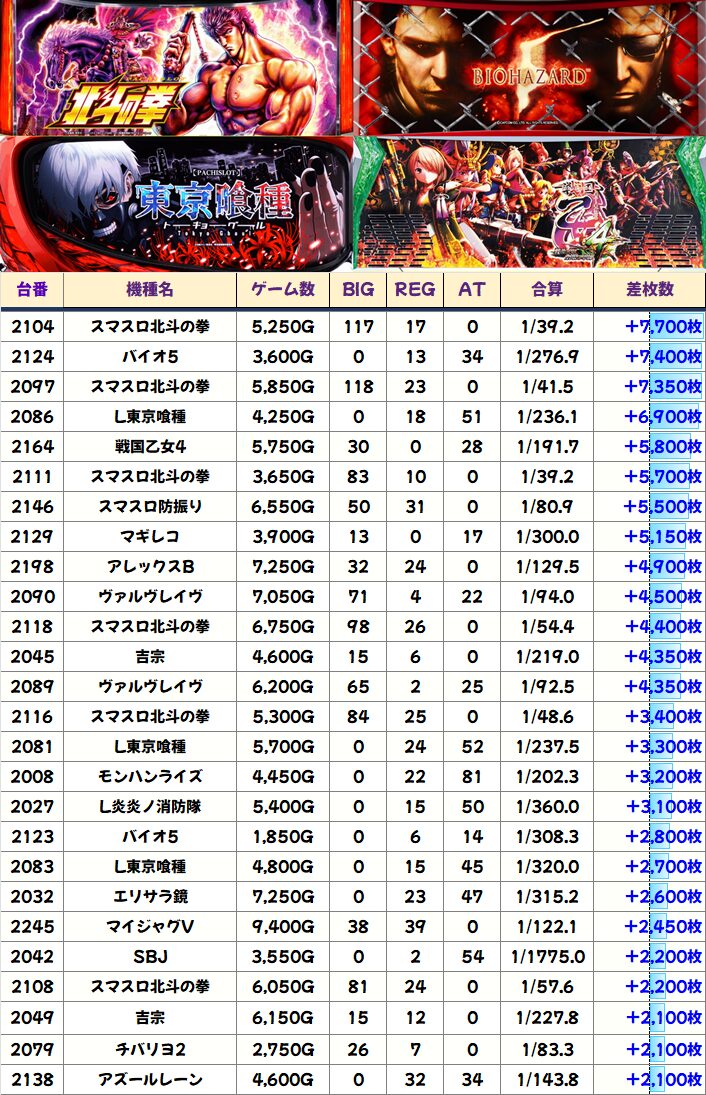 「北斗の拳」&「バイオ5」&「東京喰種」の+7000枚クラスなど、+2000枚を超える優秀台を30台近く確認!