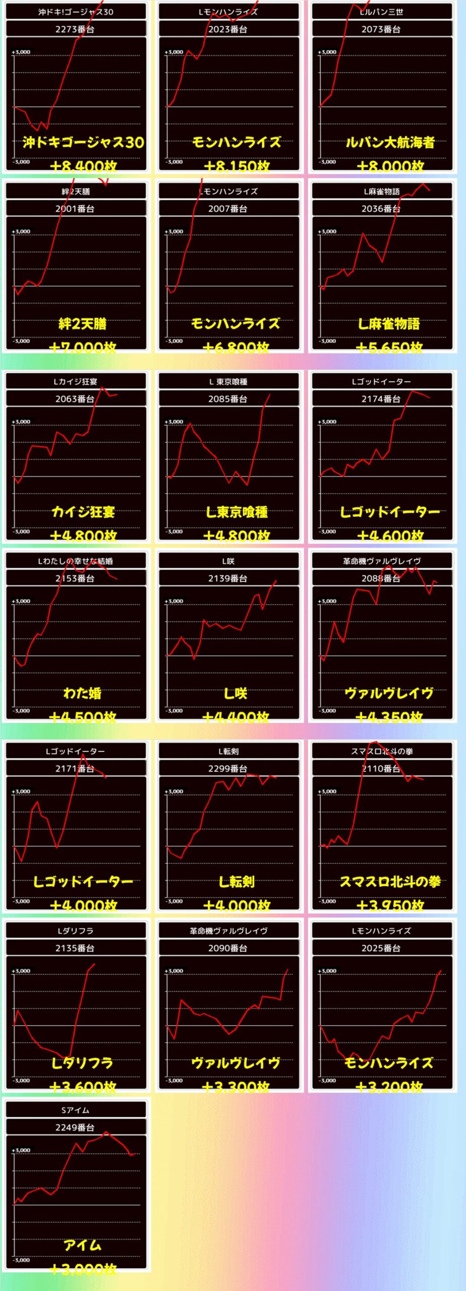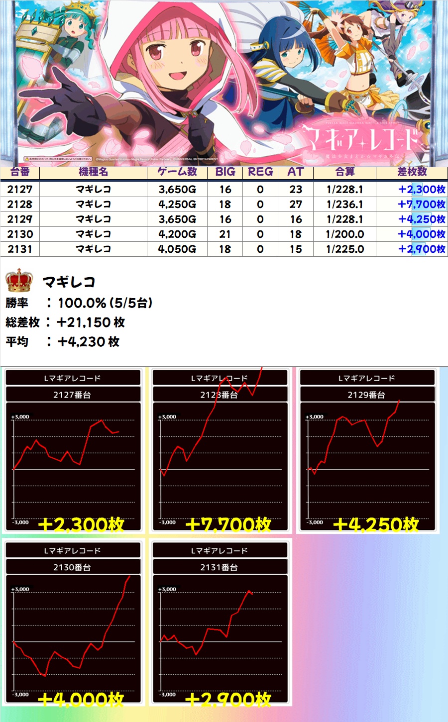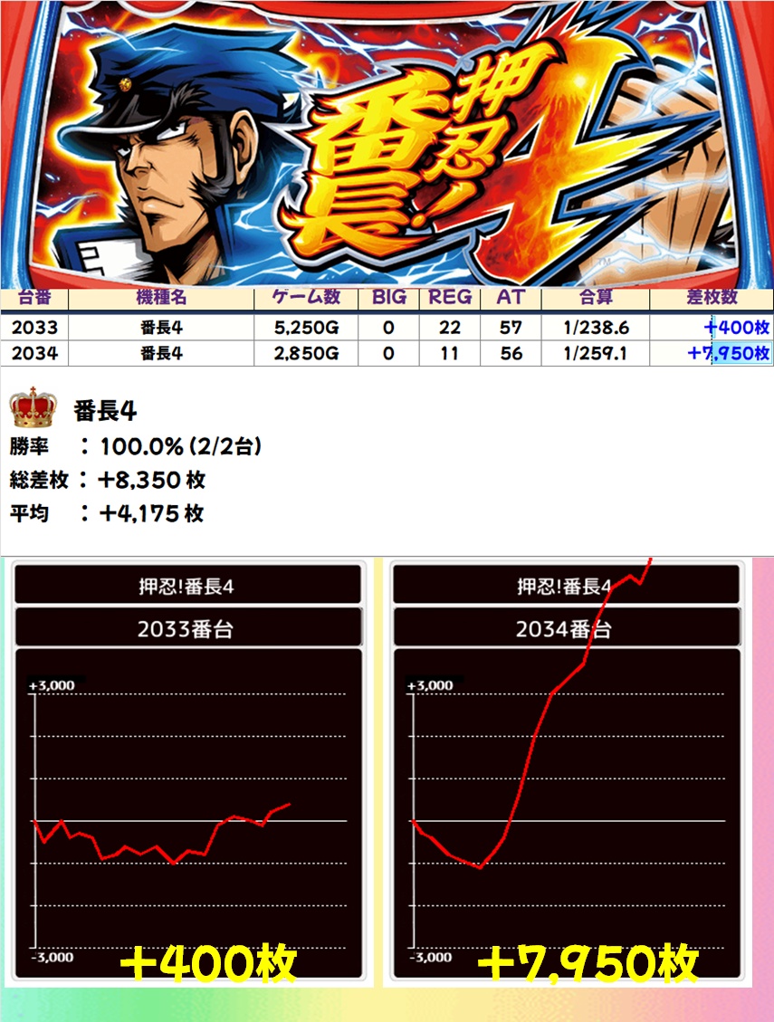 +7700枚を筆頭に全台+2000枚以上と抜群の安定感発揮し、平均+4000枚オーバーを達成!