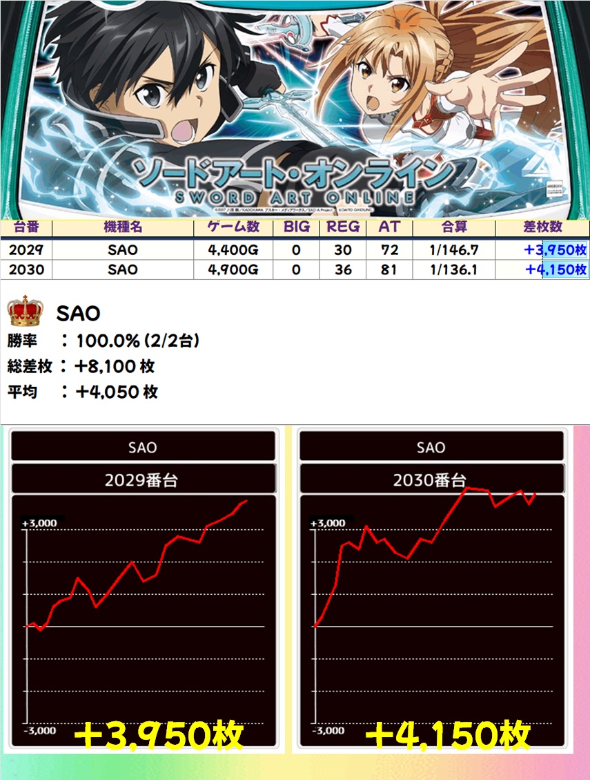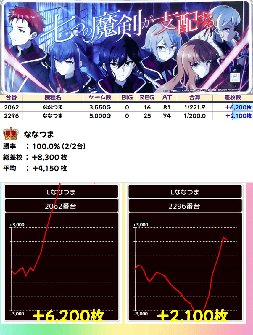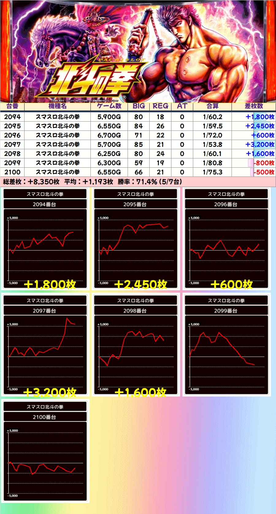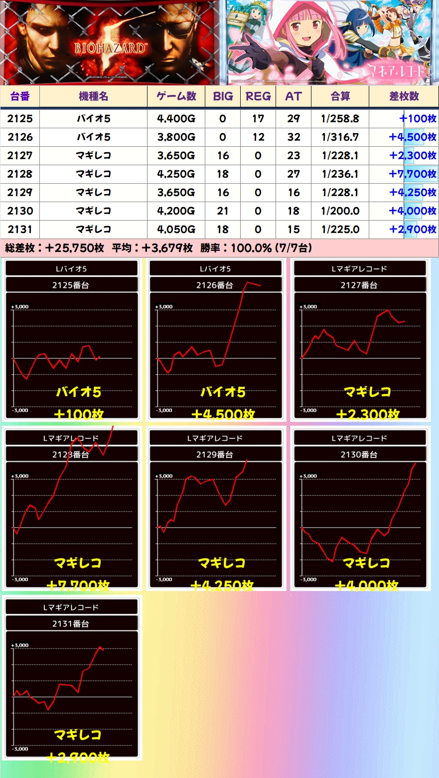 +7700枚を筆頭に全台+2000枚以上と抜群の安定感発揮し、平均+4000枚オーバーを達成!