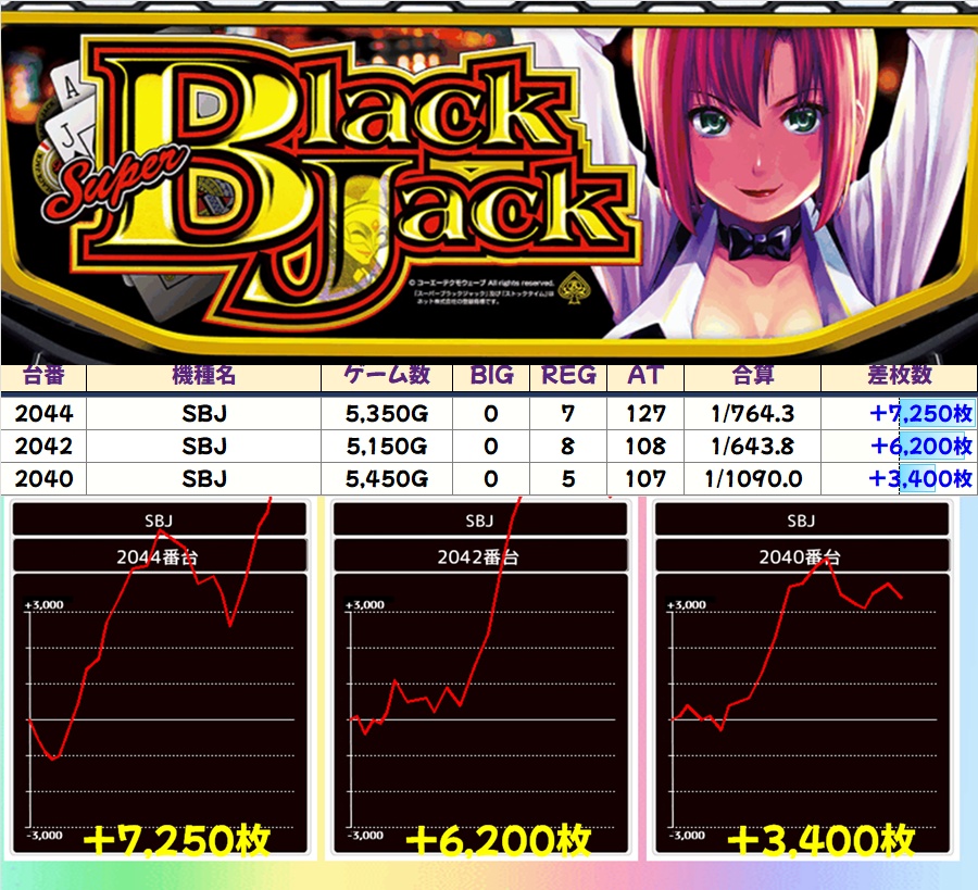 特に「SBJ」は5台中2台が+6000枚以上と抜群で平均+2500枚オーバーを達成!