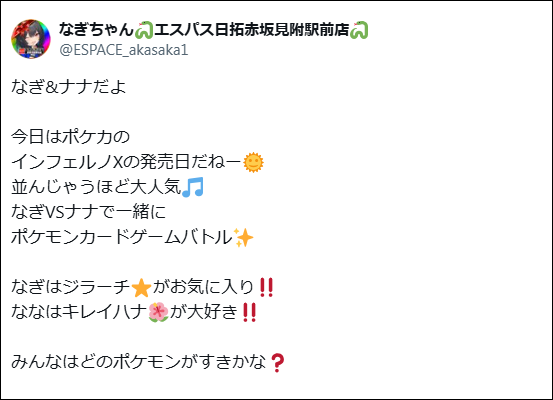 公式Xでは「なぎちゃんの独り言」もしっかり発動。