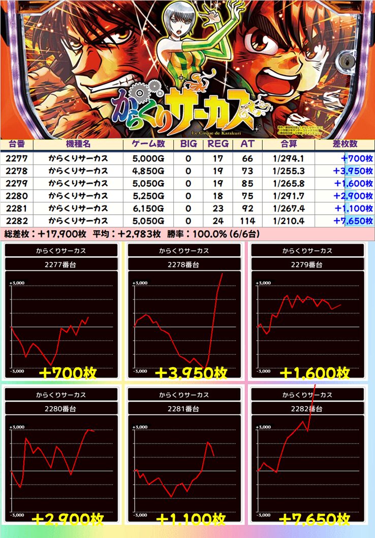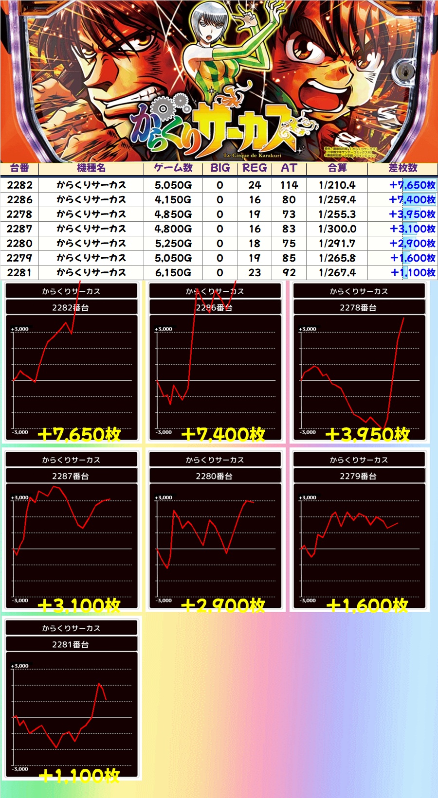 他にも機種またぎの7台並び、1/2系濃厚でもある「からくりサーカス」の6台並びなどがあり、どちらも平均+3000枚クラスとバッチリでした!