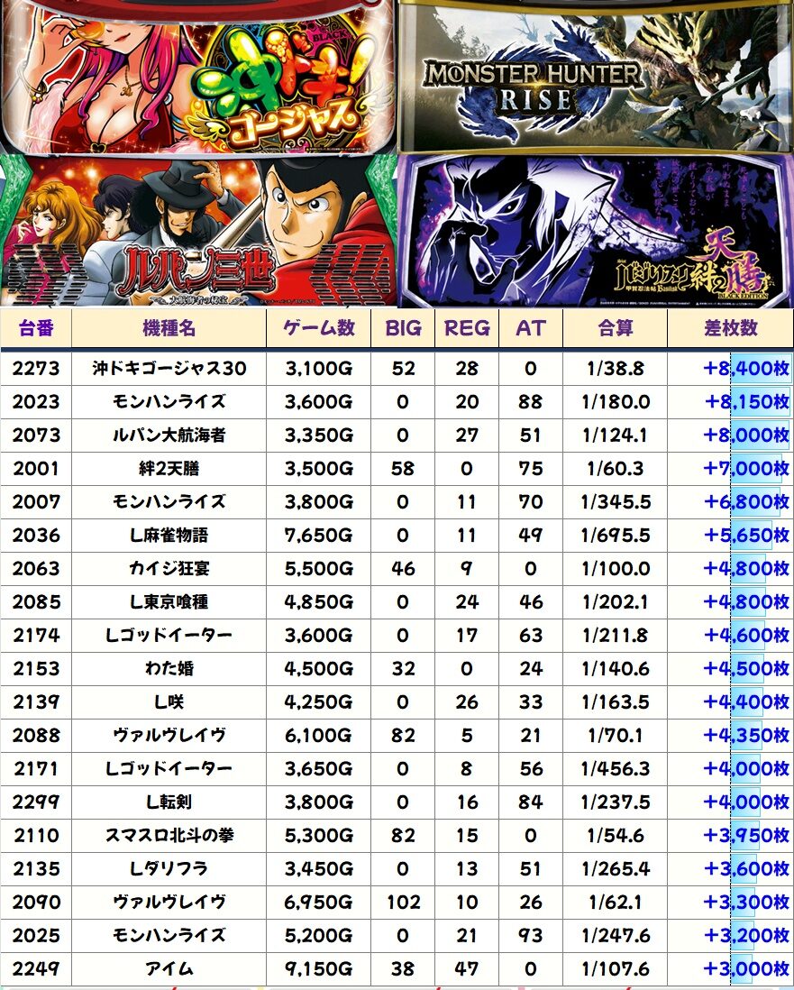 前述した仕掛け以外にも「沖ドキゴージャス」&「モンハンライズ」&「ルパン大航海者」の+8000枚以上トリオなど、単品の優秀台もたっぷりありました!