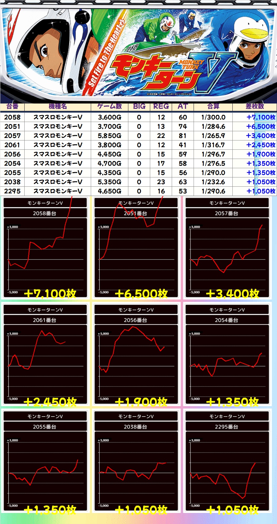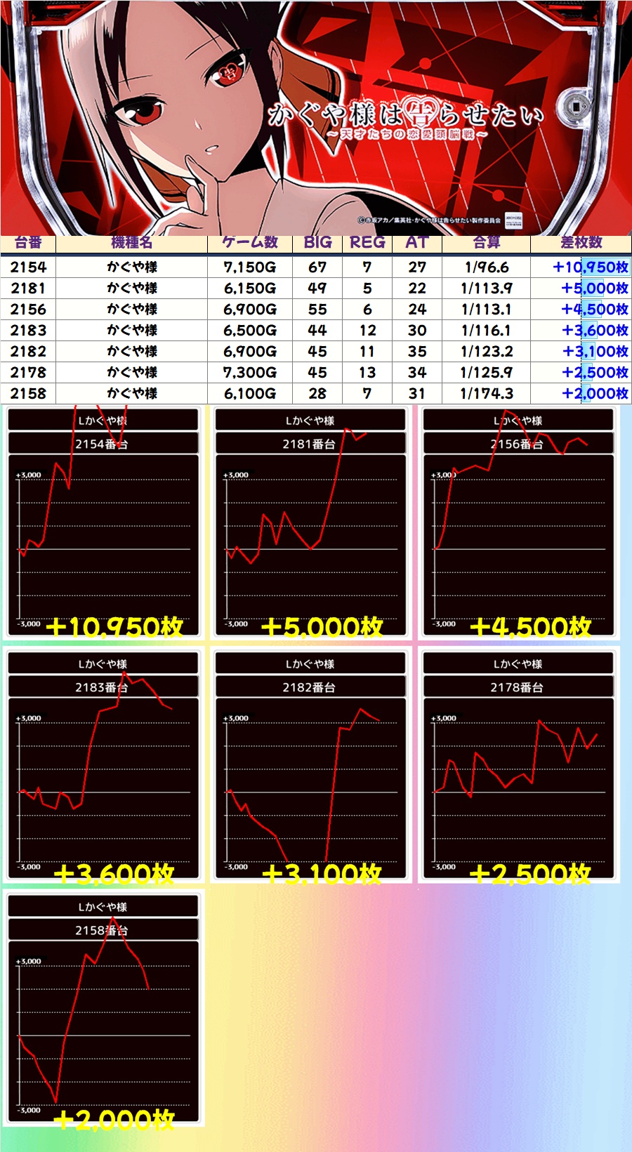 「かぐや様」は万枚オーバー&+5000枚!「からくりサーカス」は+7000枚以上×複数!「モンキーV」は+7000枚クラス×複数!など各機種から猛爆台を確認!