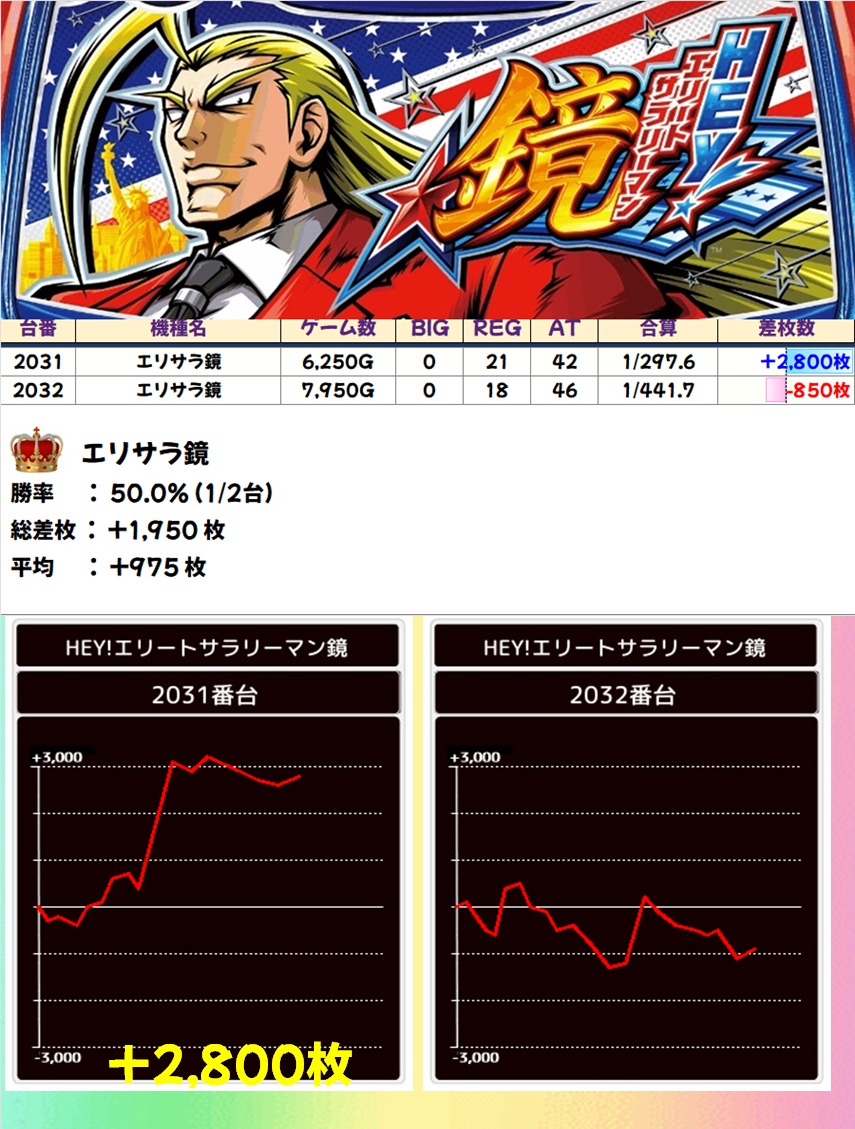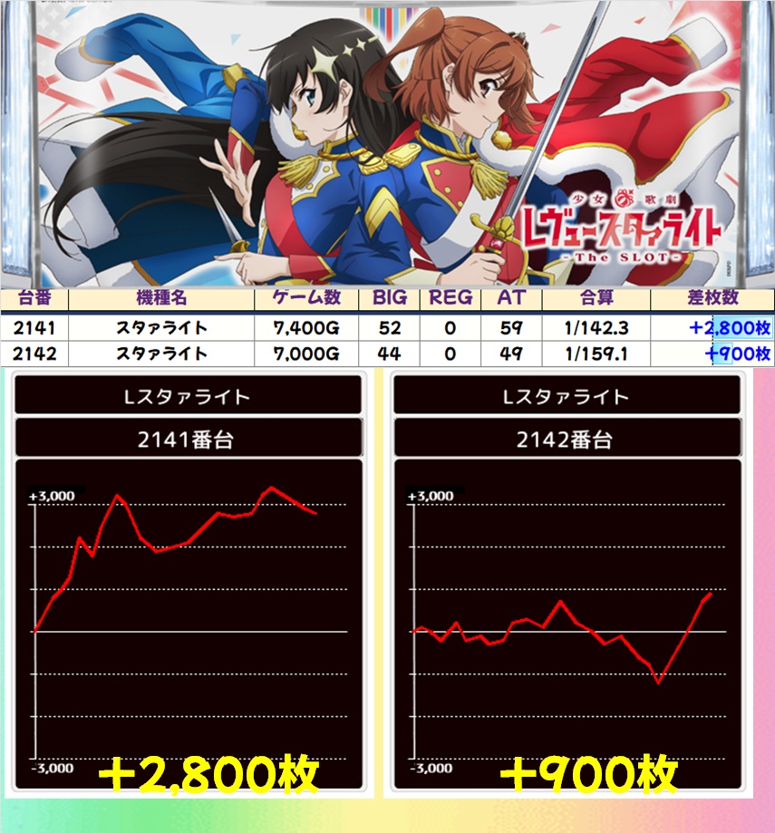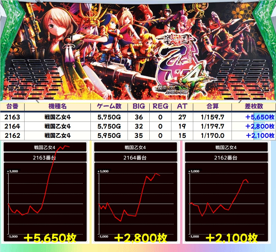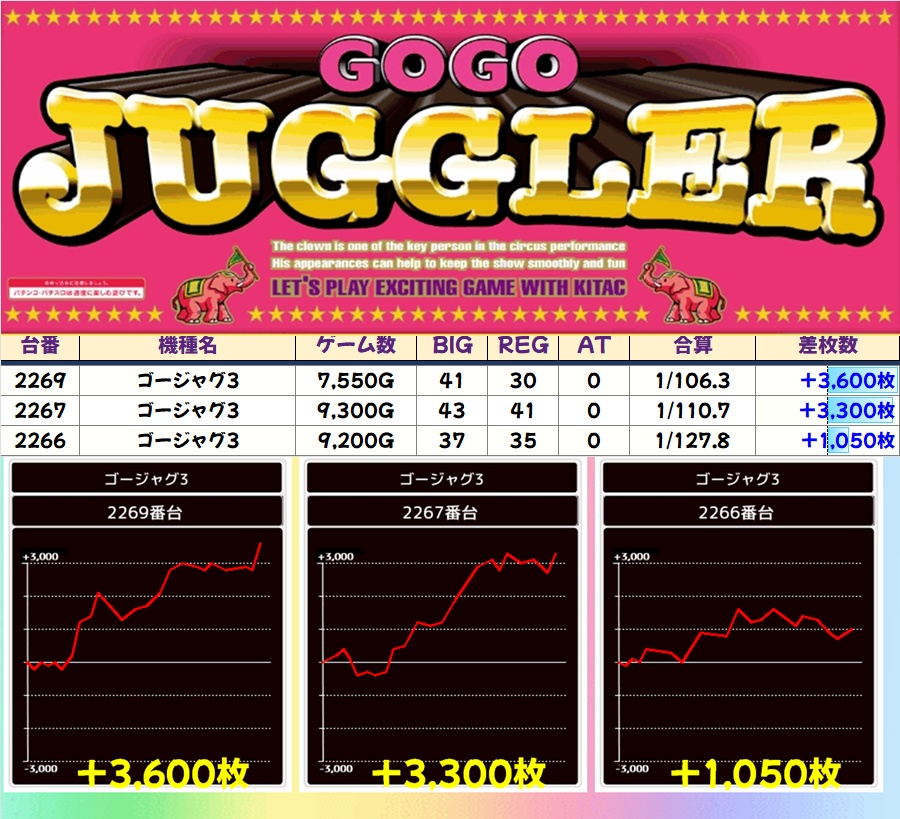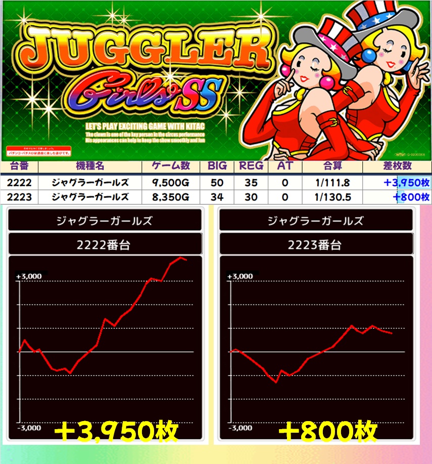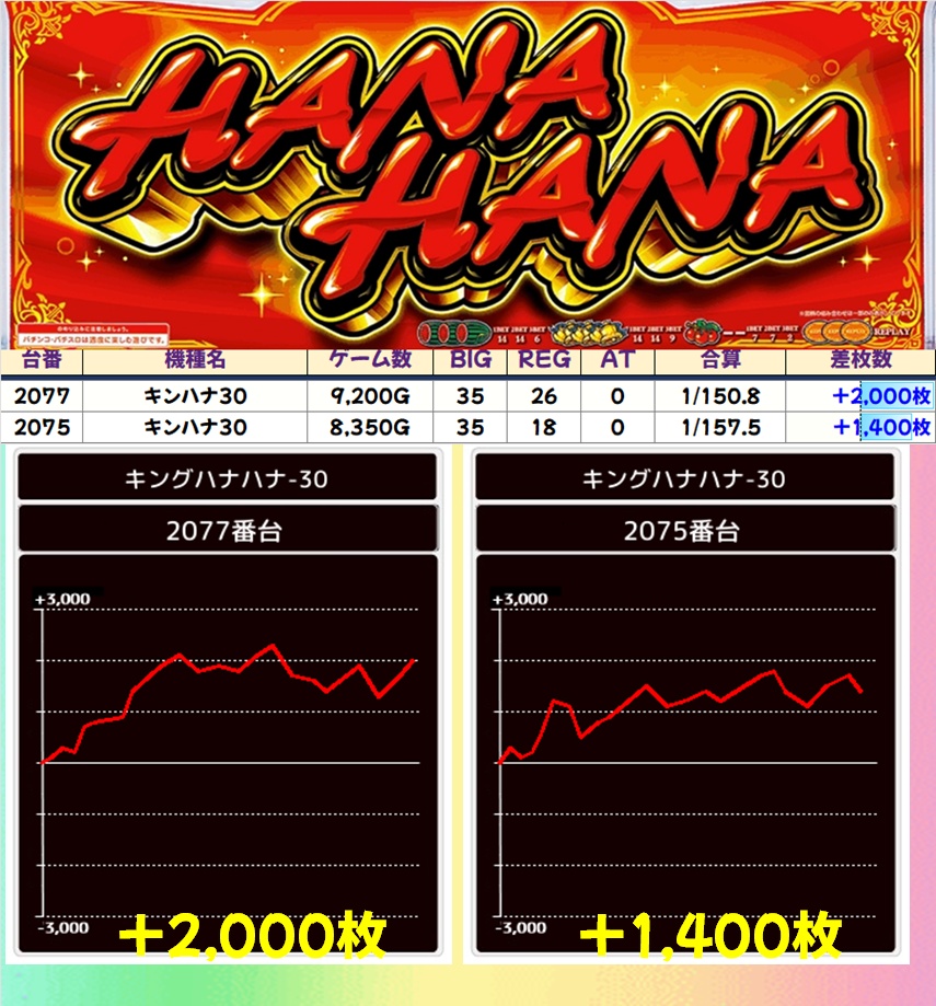 両機種に+2000枚以上かつ、対象の全5台が+1000枚以上としっかり結果を残しました!