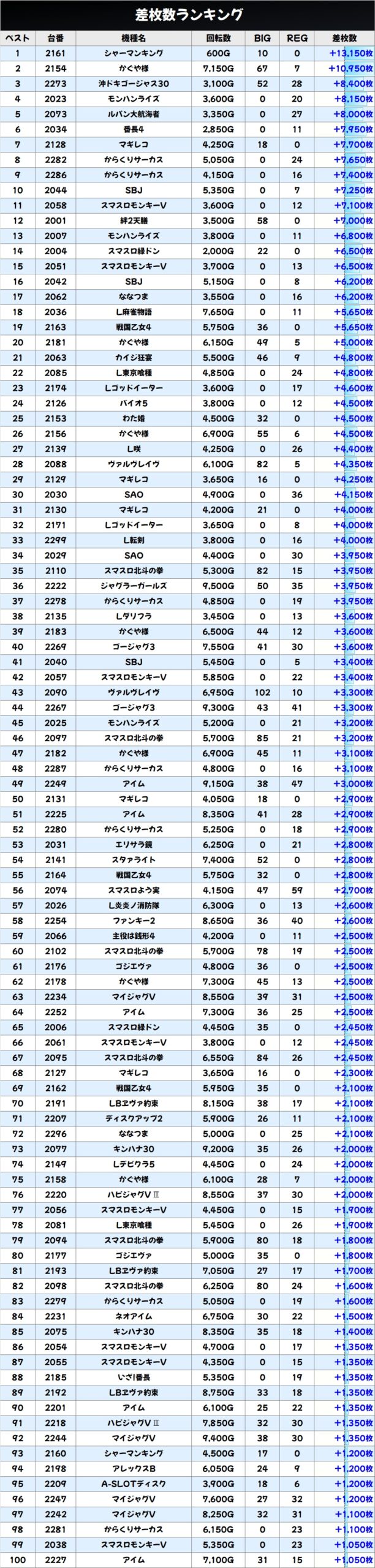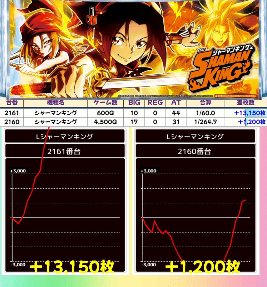 この日のナンバーワン差玉を叩き出した「シャーマンキング」の+13150枚を筆頭に各機種から+2000枚以上の優秀台を確認!