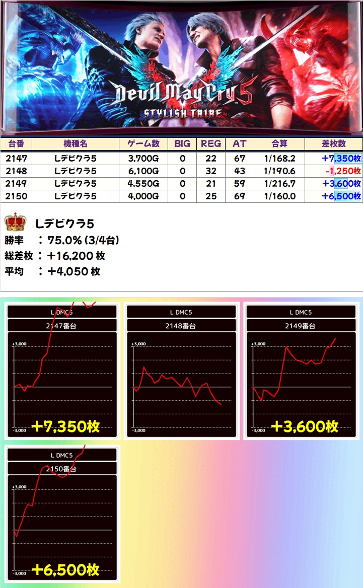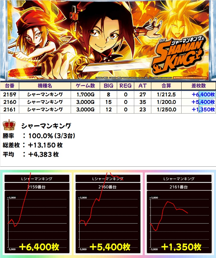 「デビクラ5」は4台中2台が+6000枚以上、「シャーマンキング」も3台中2台が+5000枚以上と爆裂台が充実で、共に平均+4000枚以上と抜群の結果に!