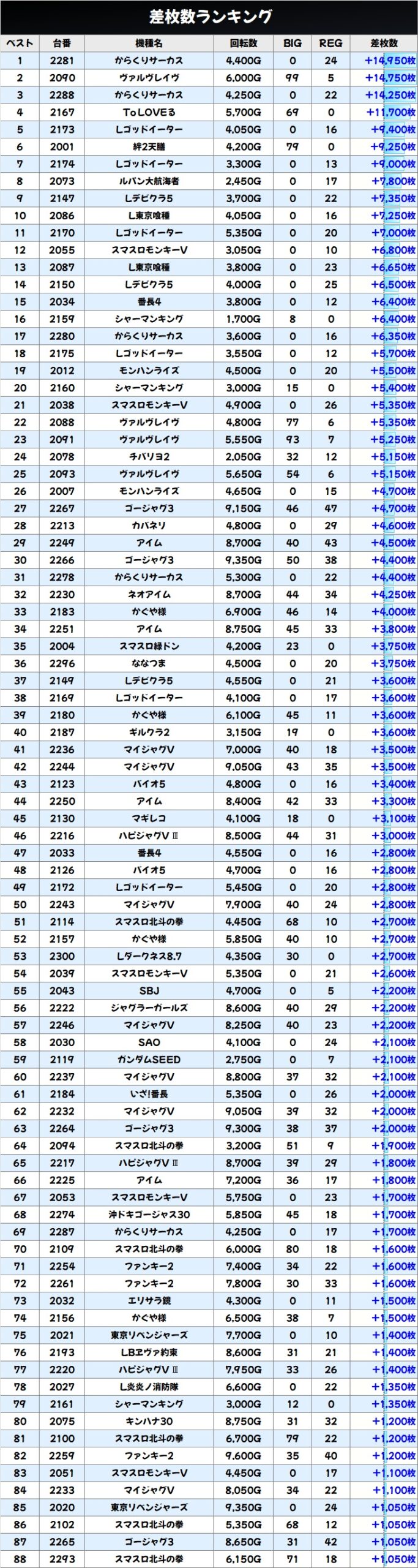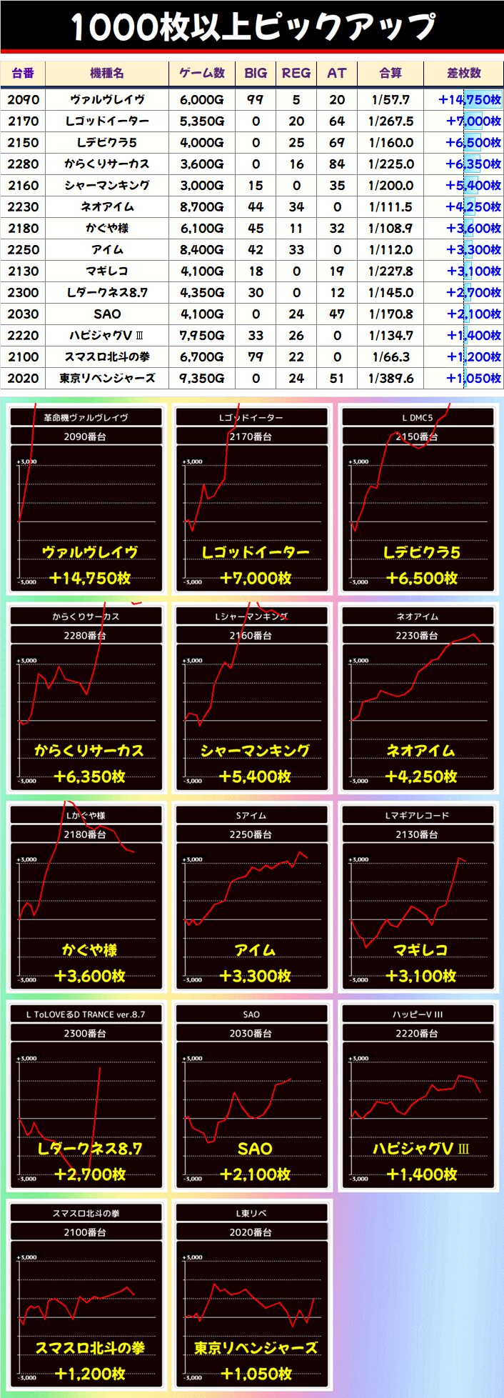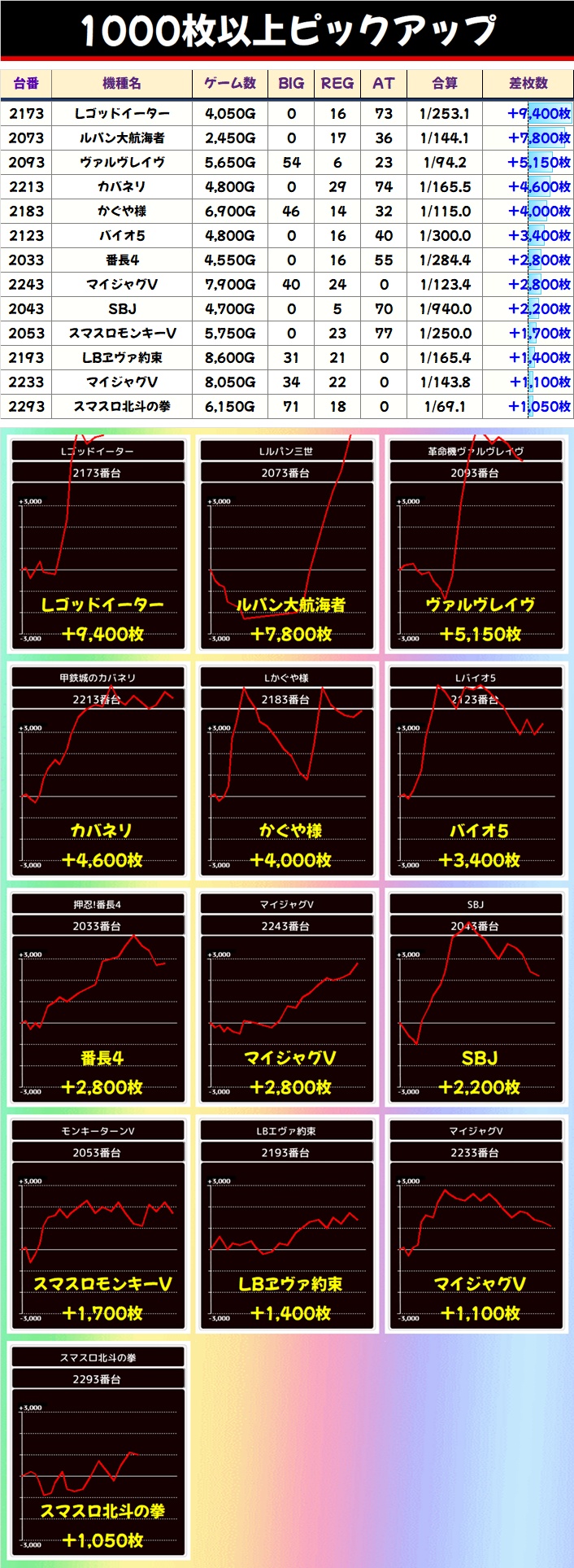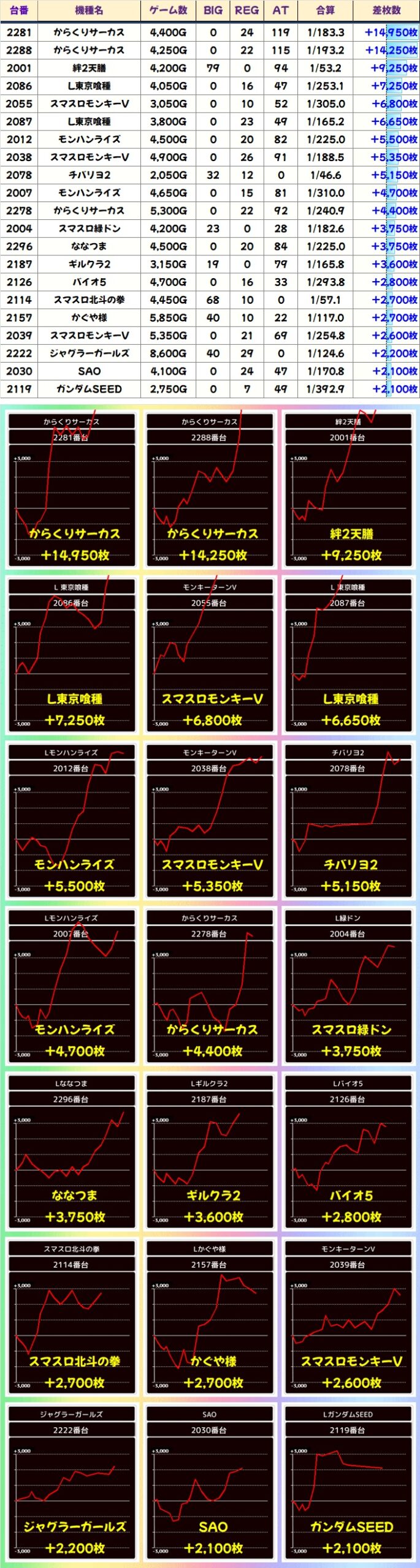 +9000枚以上×複数など7台中4台と半数以上が+5000枚を突破する躍進ぶりで、平均+5107枚と大爆発!