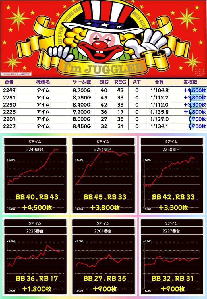 この日の出玉を牽引したジャグシリーズから「マイジャグV」「アイム」「ゴージャグ」「ハピジャグ」の4機種が仕掛け対象に!各機種に+3000枚以上など優秀台をたっぷり確認!
