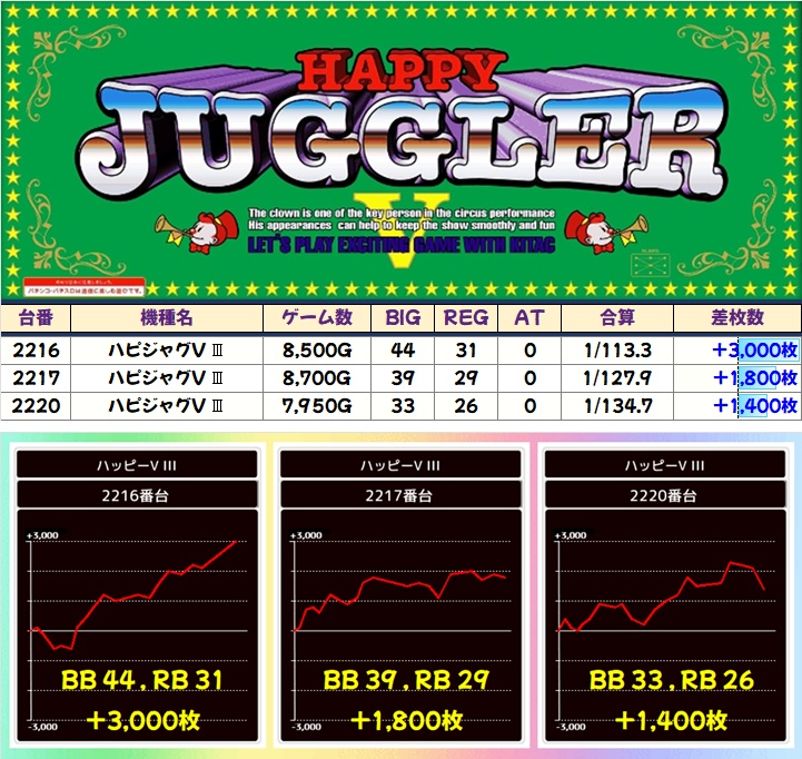 ハピジャグV Ⅲ(3/5台+)➡平均+1,090枚