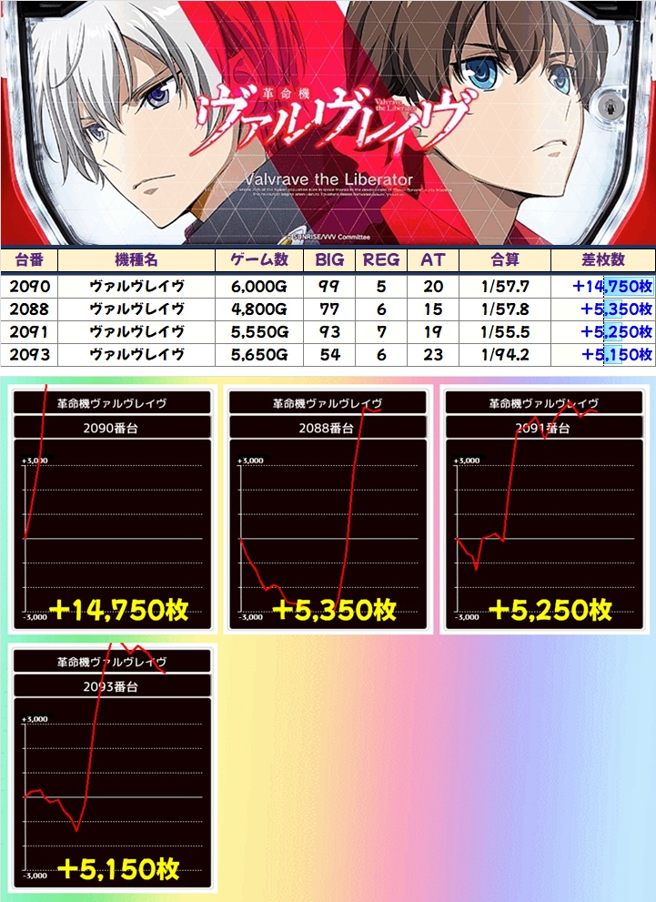 万枚製造機「ヴァルヴレイヴ」は、+14750枚を筆頭に8台中4台と半数の台が+5000枚を突破!
