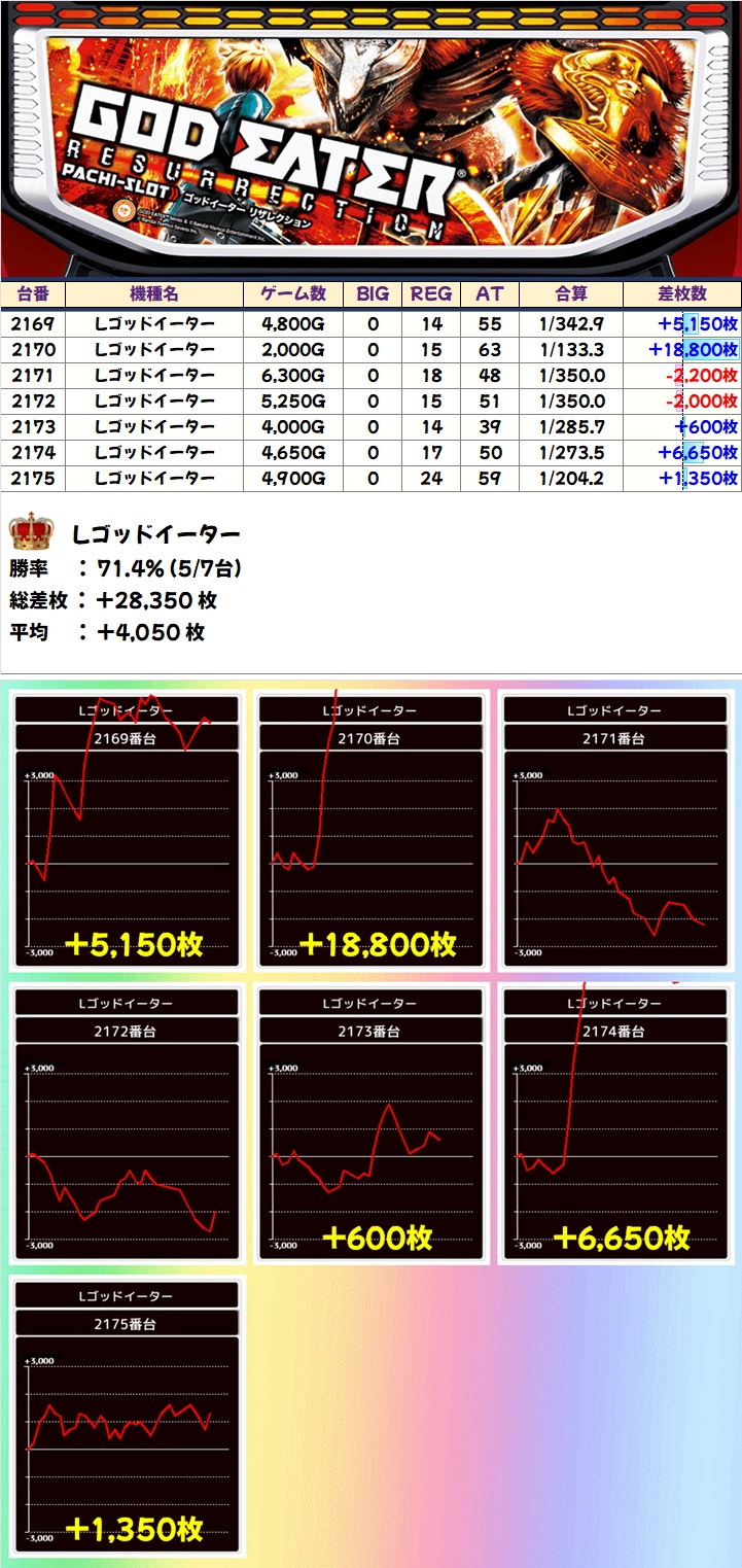「ゴッドイーター」はコンプ台を筆頭に7台中3台と半数近い3台が+5000枚以上を達成!