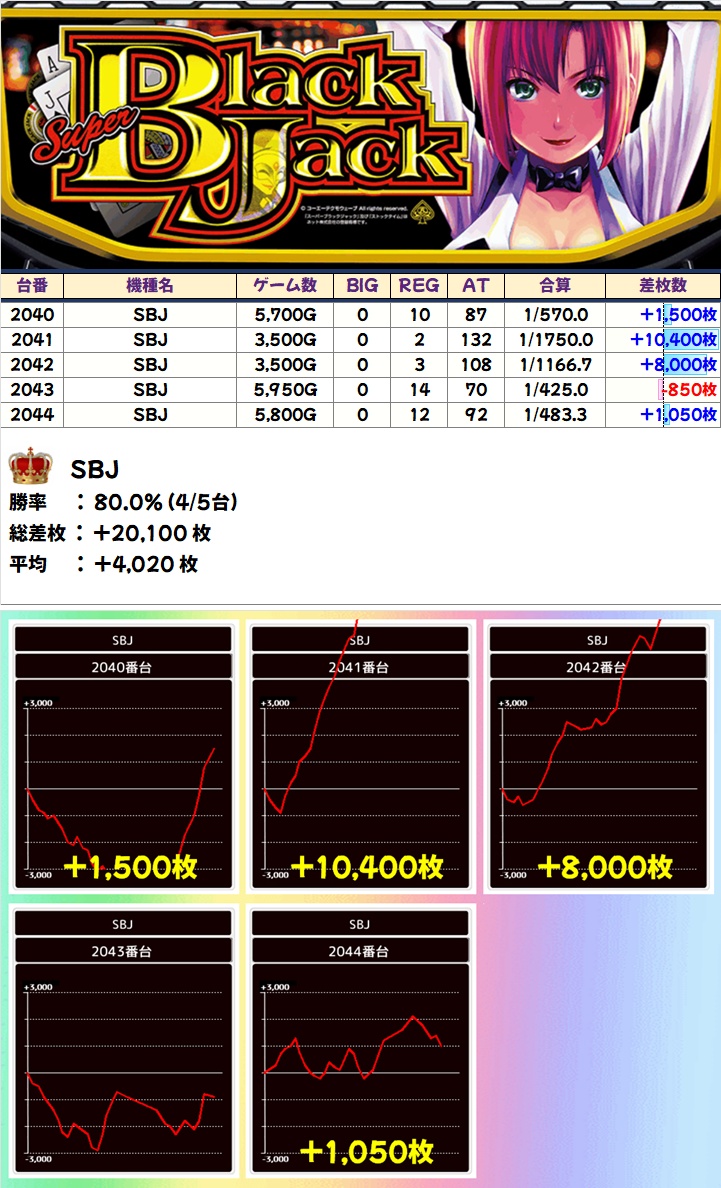 仕掛けの常連「SBJ」は万枚オーバー、+8000枚など爆裂台を含む5台中4台がプラスに!