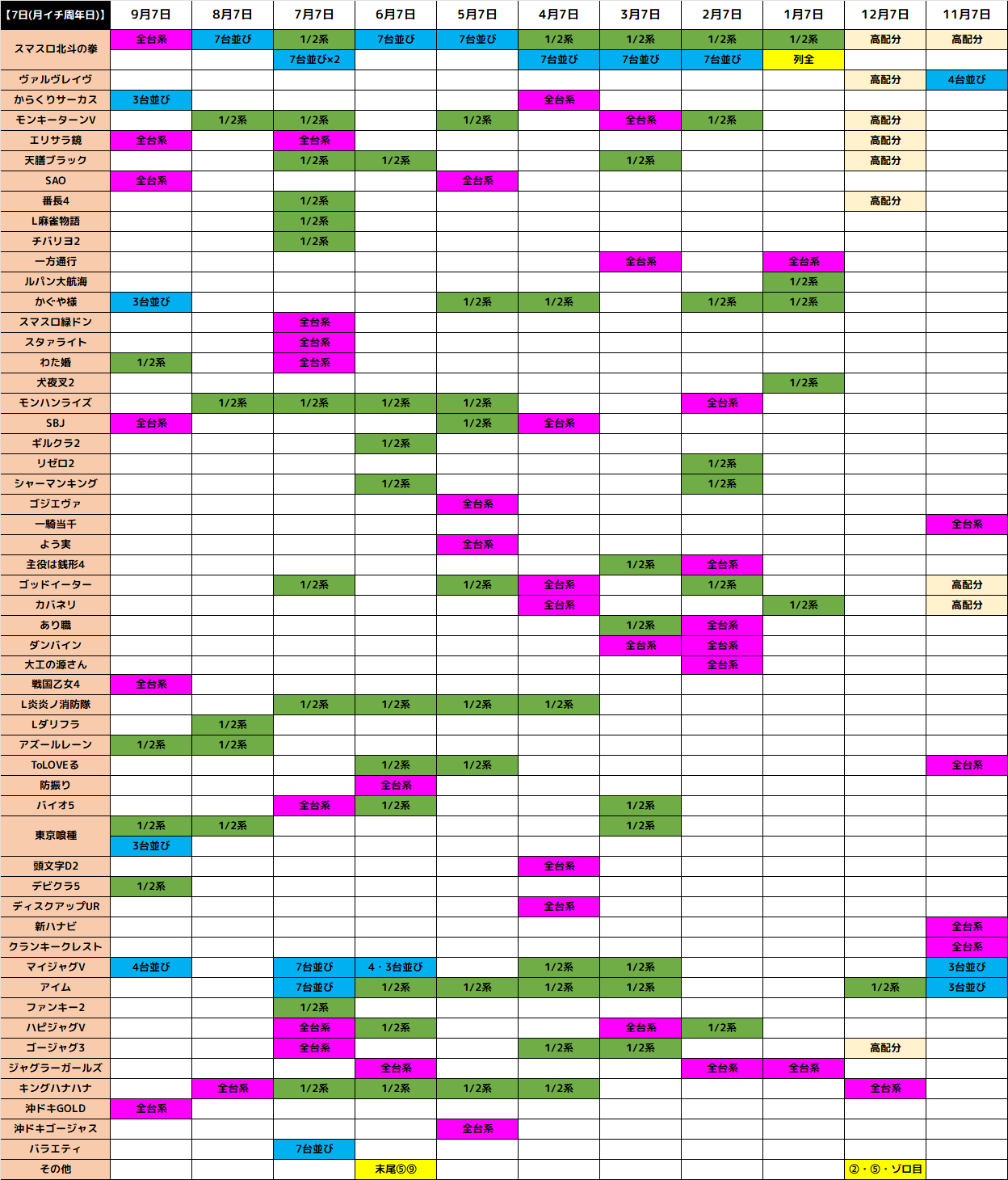 優秀台多数の「スマスロ北斗の拳」については後述しますが、⑦の日名物の7台並びを確認!