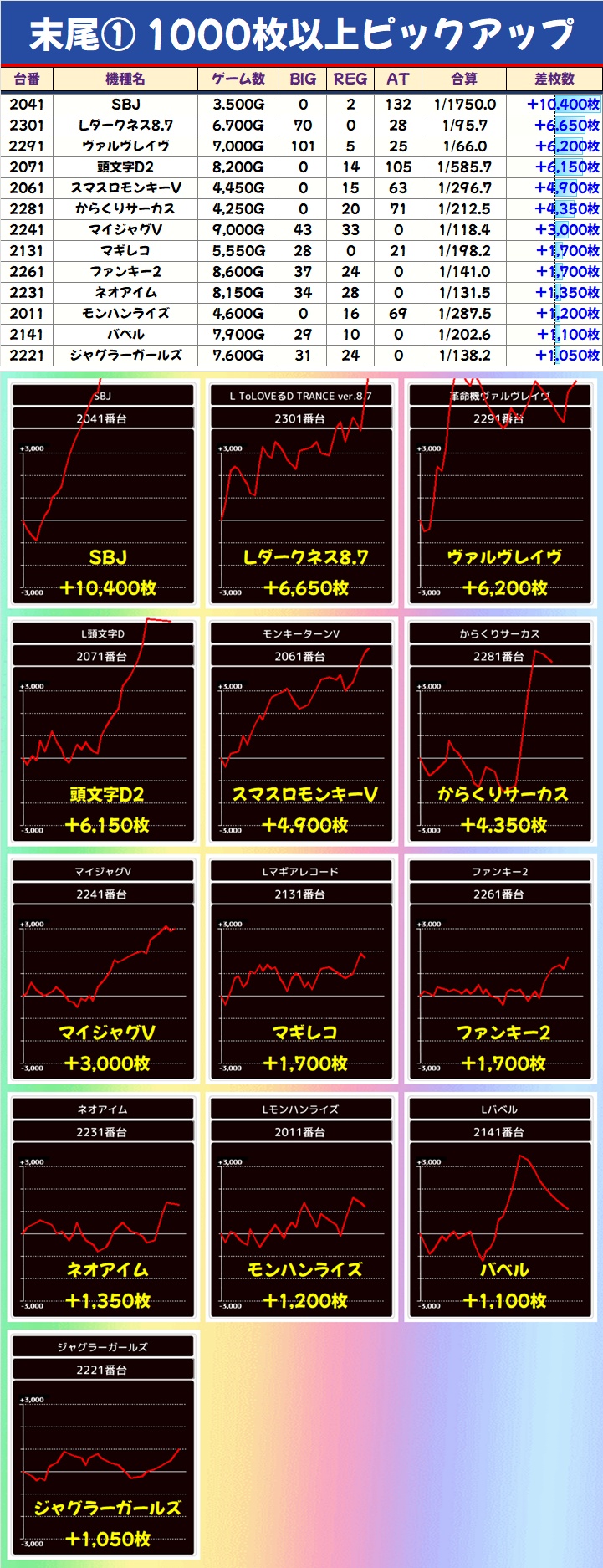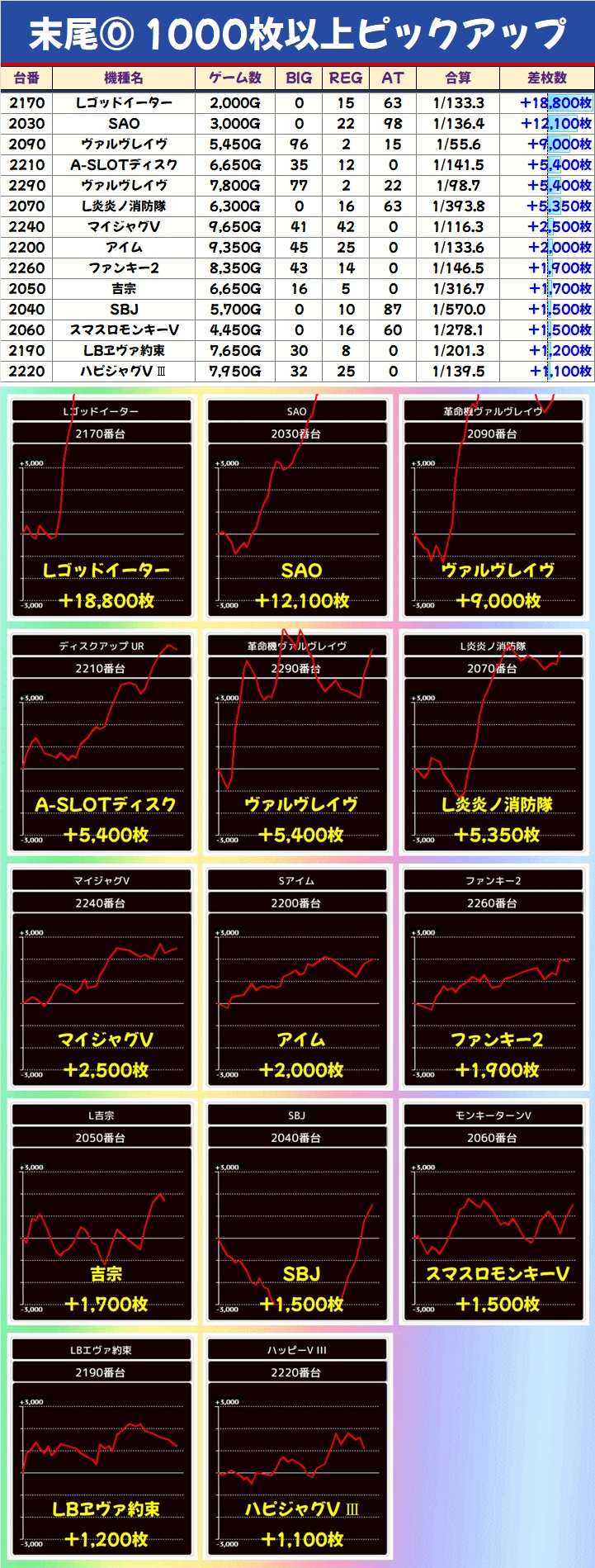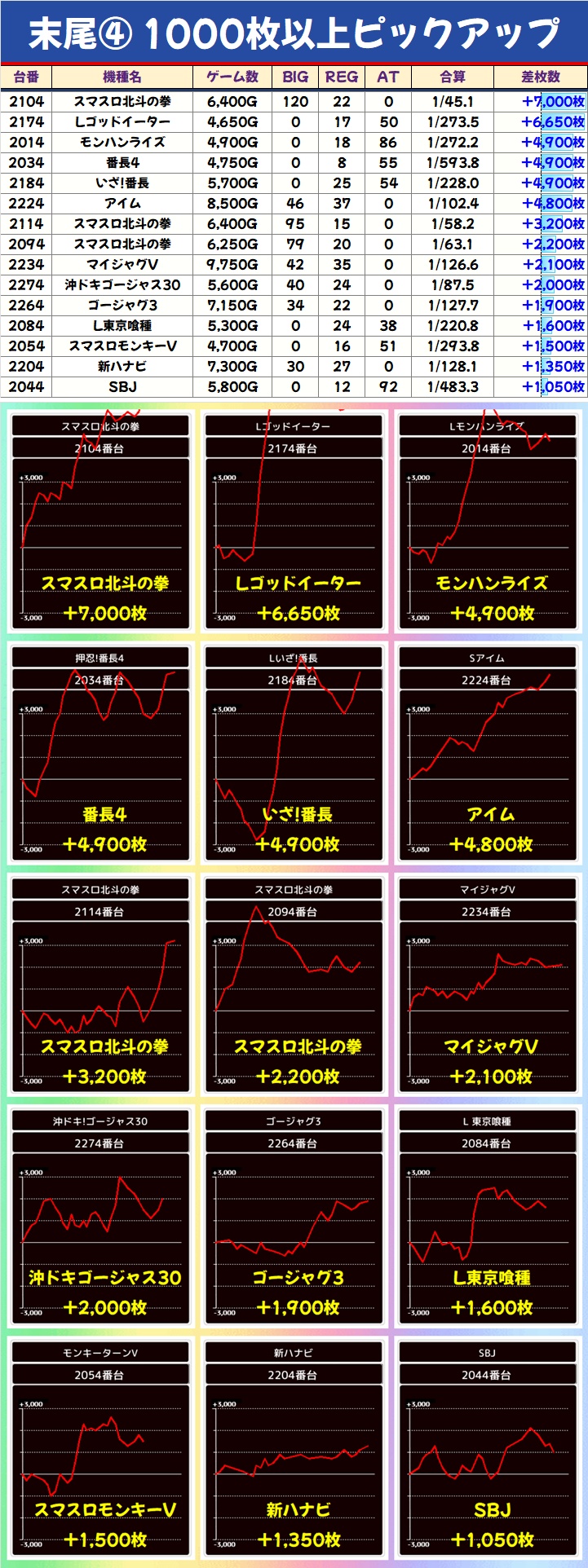 この日は「末尾⓪」&「末尾①」&「末尾④」と勝率5割以上&平均+1000枚を超える末尾を3本も確認!