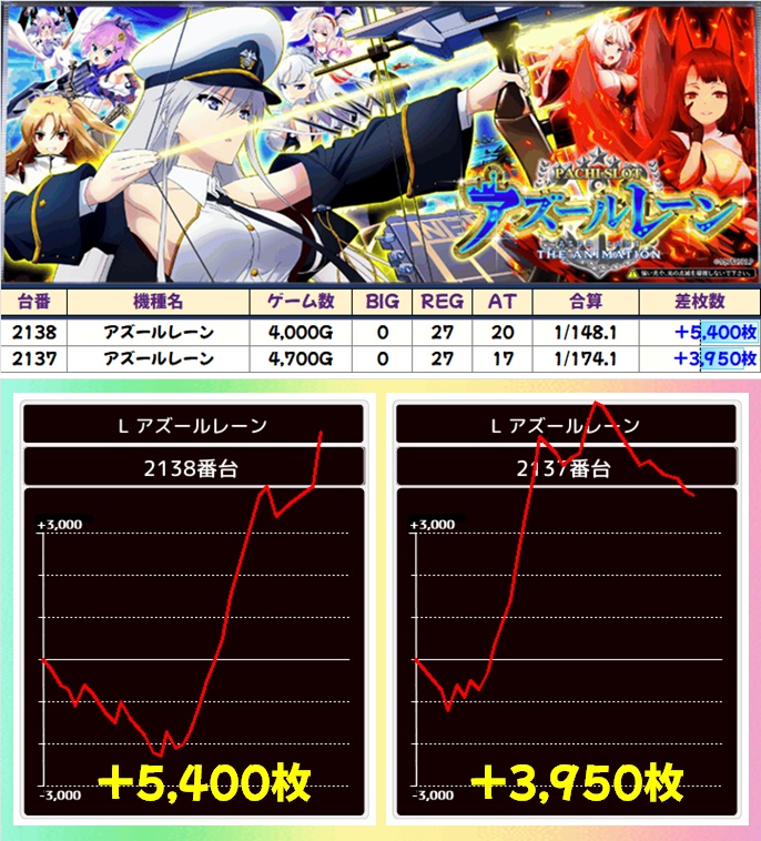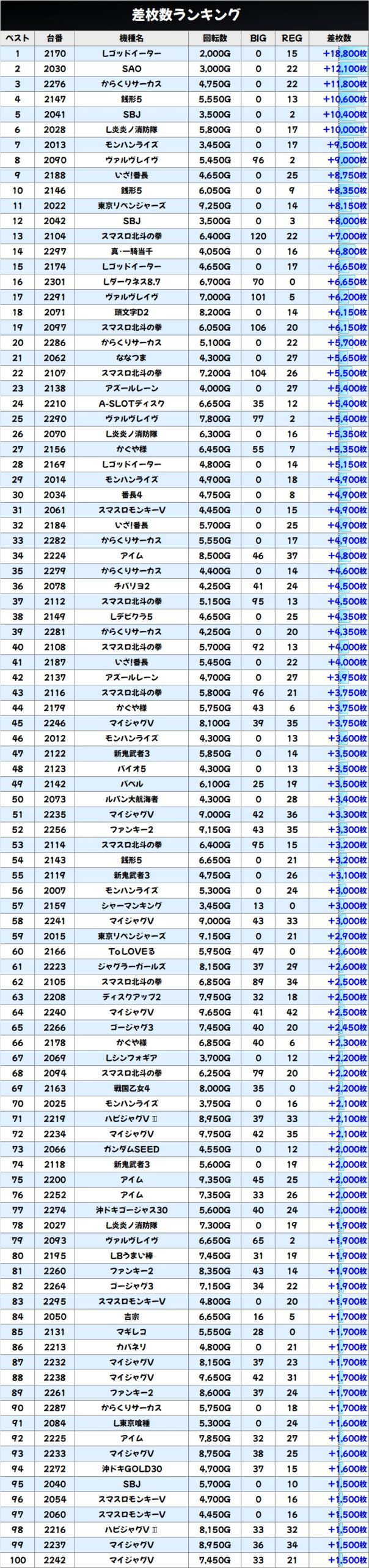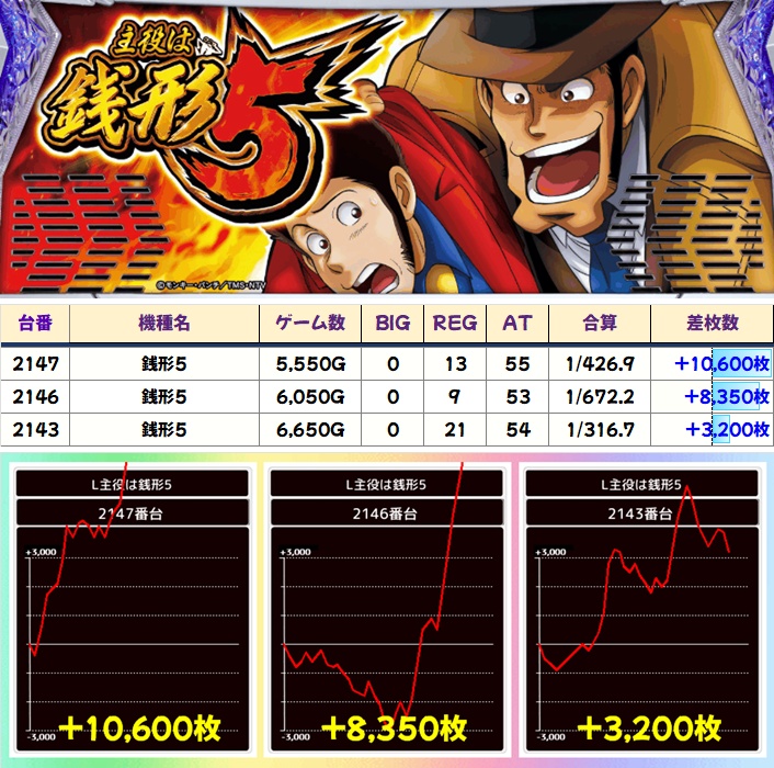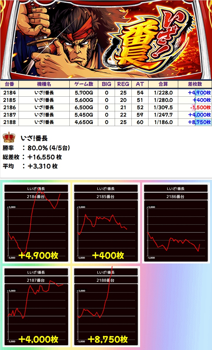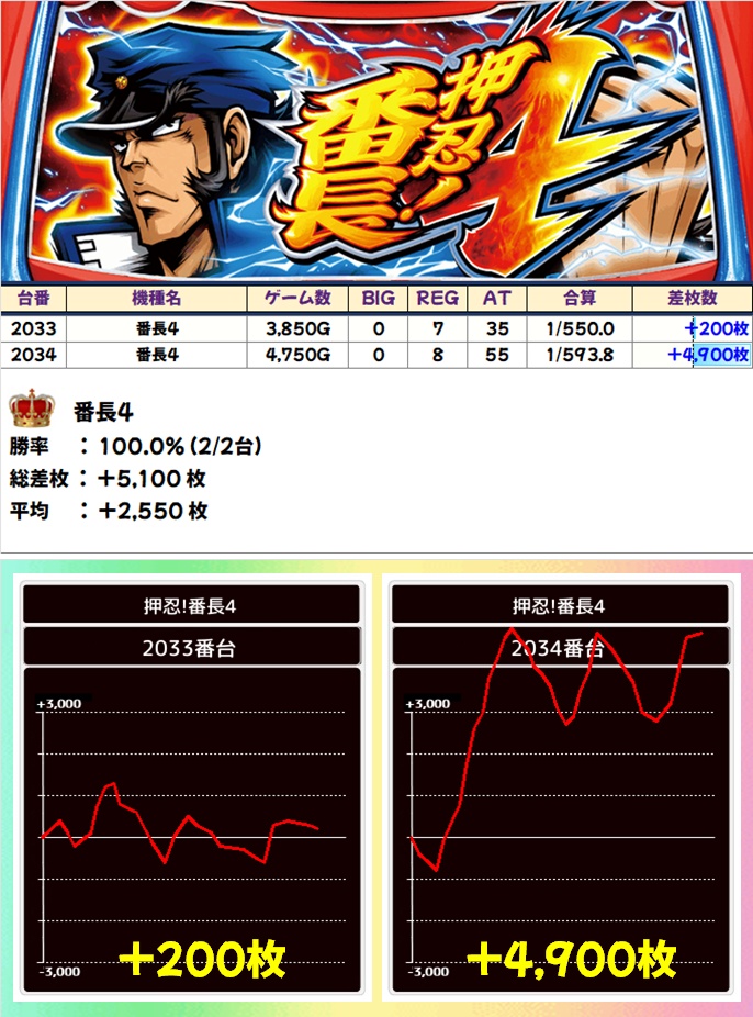 両機種に+4000枚以上の猛爆台がありましたが、「いざ!番長」は特に優秀で+8750枚を筆頭に5台中3台が+4000枚以上と素晴らしい結果に!