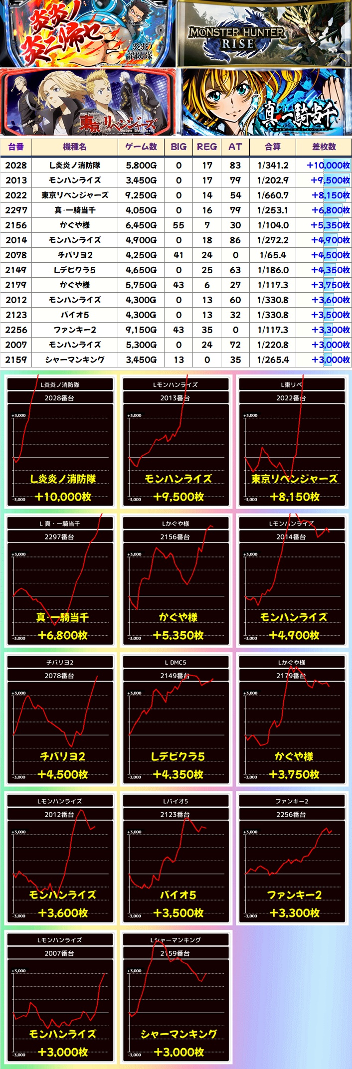前述した非常に充実していた仕掛け以外にも「炎炎ノ消防隊」の万枚、「モンハンライズ」の+9000枚以上、「東リベ」の+8000枚以上など、本周年日らしく単品優秀台もたっぷり!
