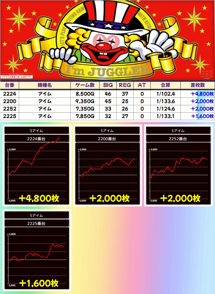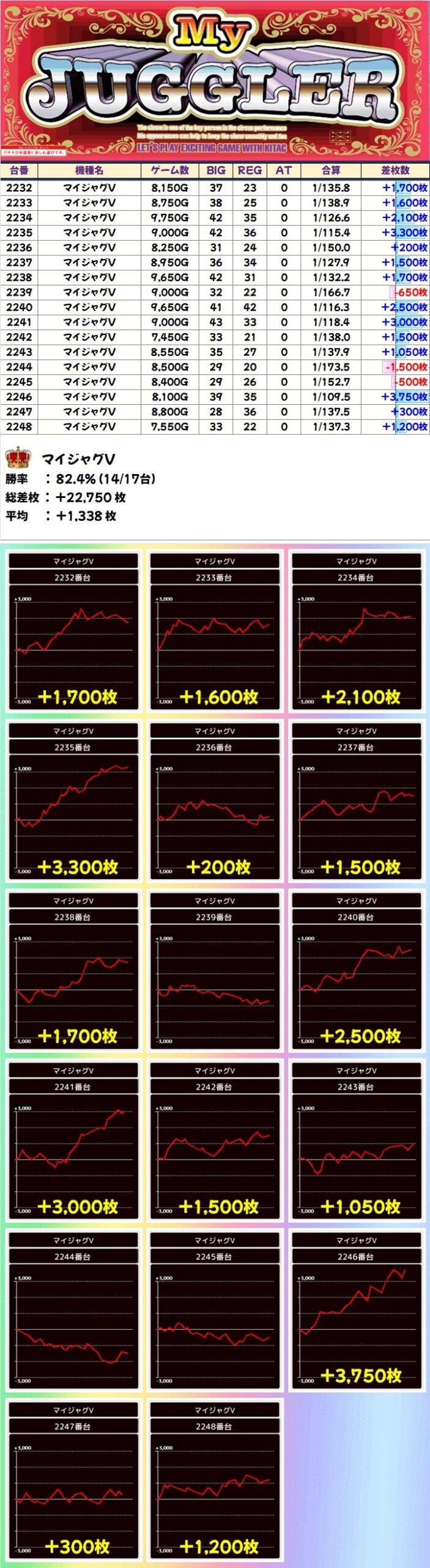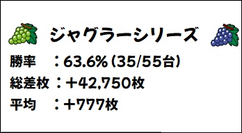 この日はジャグラーシリーズが本当に優秀で全体の勝率が6割以上、平均+777枚、総差枚+約4.3万枚を達成!
