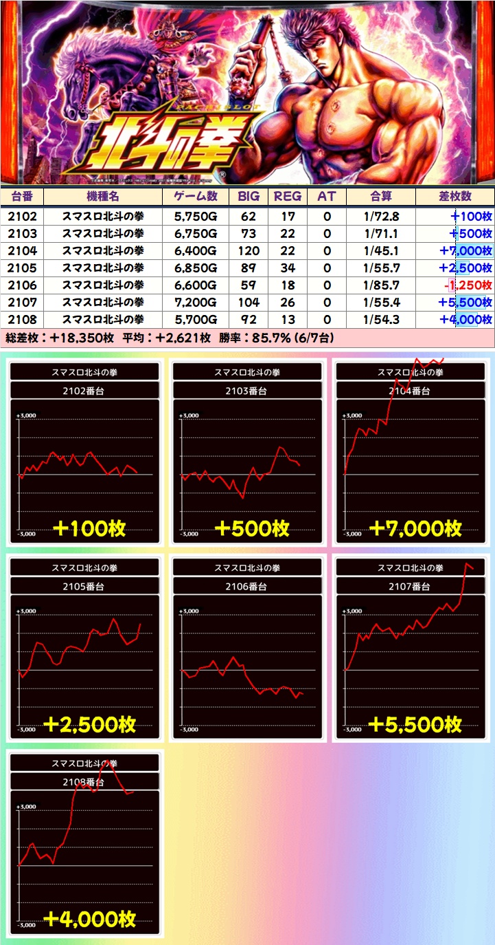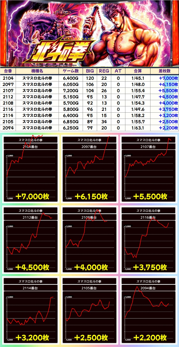 ⑦の日と言えば、「北斗の拳」の7台並びが恒例ですが、+7000枚を筆頭に半数近い3台が+4000枚以上で平均+2621枚と抜群!