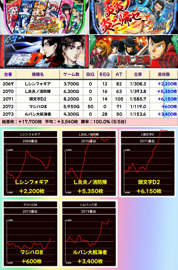 「バラエティ」の5台並びも全台大幅なプラスで平均+3542枚とコチラも素晴らしい結果に!