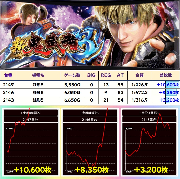 前述した全台系濃厚の「バベル」に続き、最新機種「新鬼武者3」&「銭形5」が仕掛け対象に!