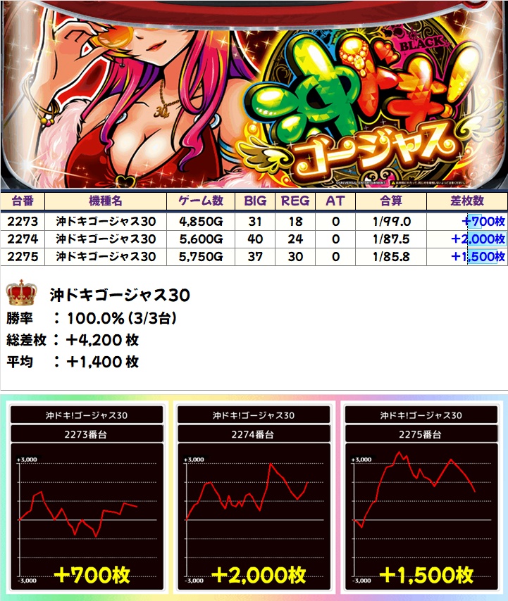 沖ドキゴージャス30(3/3台+)➡平均+1,400枚
