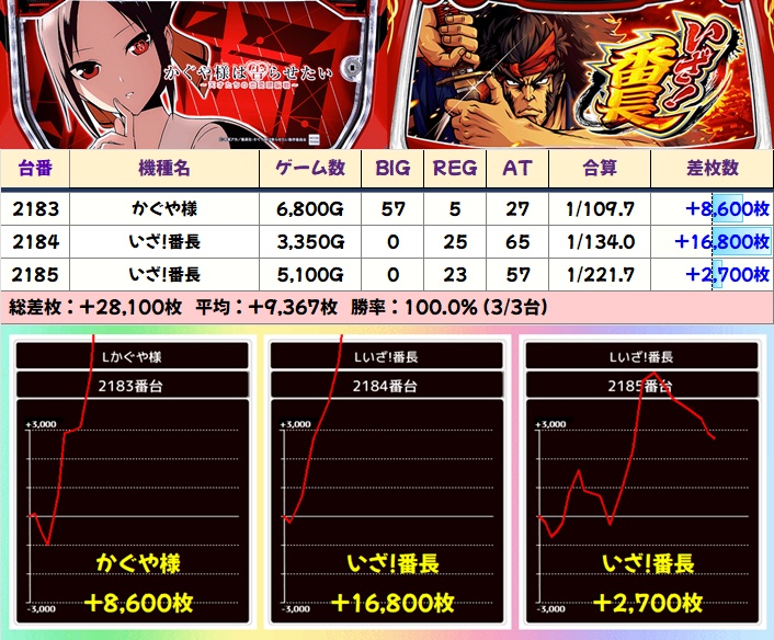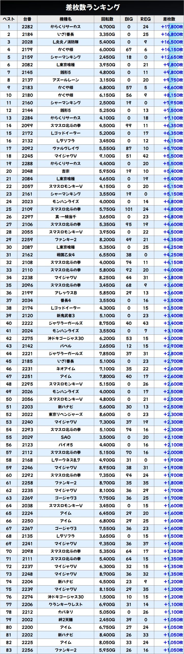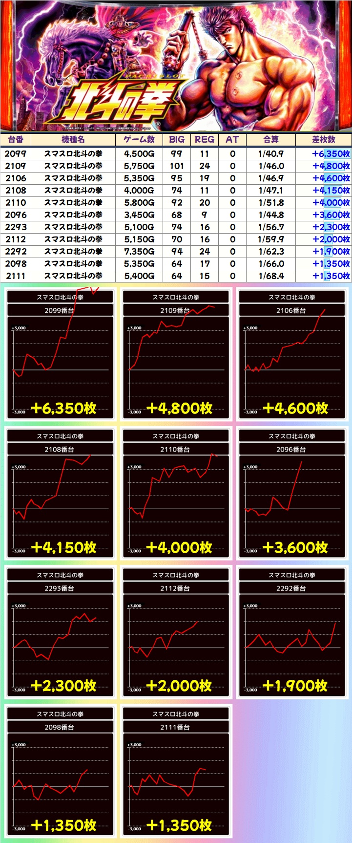 両機種とも対象の全台プラスは当たり前、特に北斗の並びは優秀で、7台中4台が+4000枚以上と抜群でした!