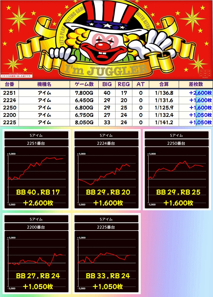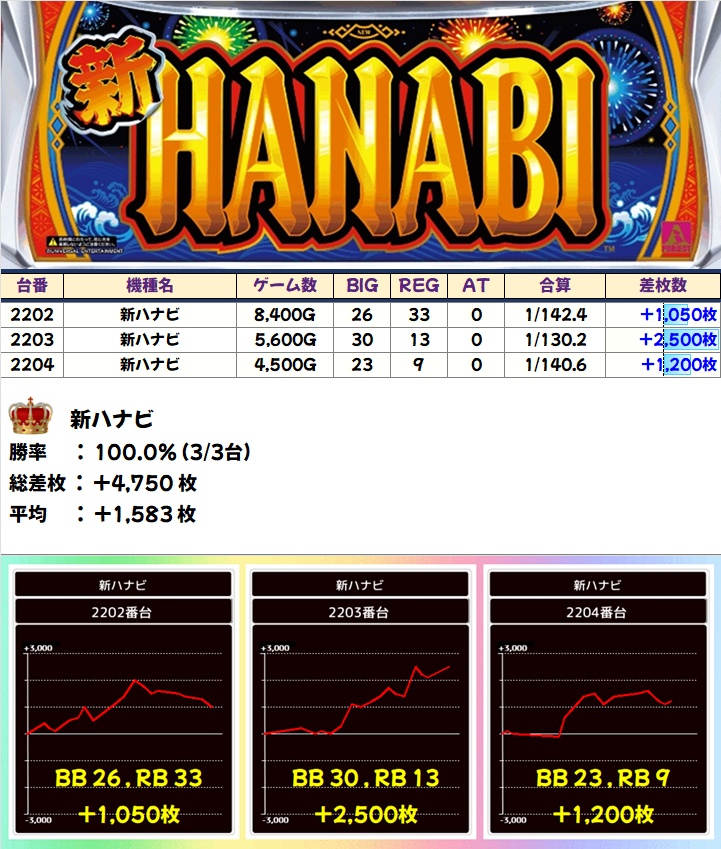 両機種とも全台プラスは当たり前、「ジャグラーガールズ」には+3000枚クラスが2台、「新ハナビ」は全台+1000枚以上と安定の好結果に!