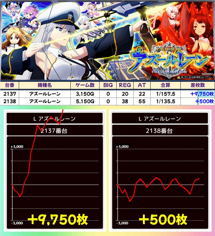 「アズールレーン」には”ほぼ万枚”、「ダリフラ」には+6000枚オーバーと両機種からモンスター台を確認!