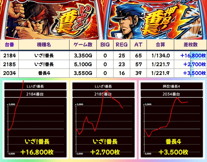 「いざ!番長」には+16800枚、「番長4」には+3500枚など素晴らしい台が続々!