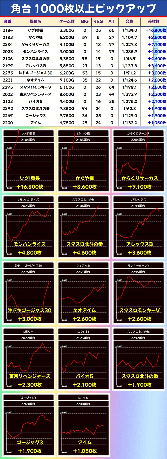 勝率が50%を大きく上回り、14台が+1000枚以上を達成!高配分以上には間違いないかなと!