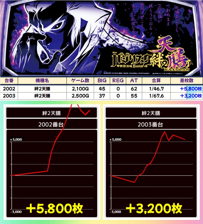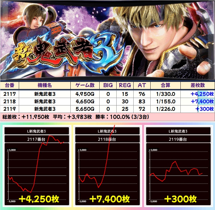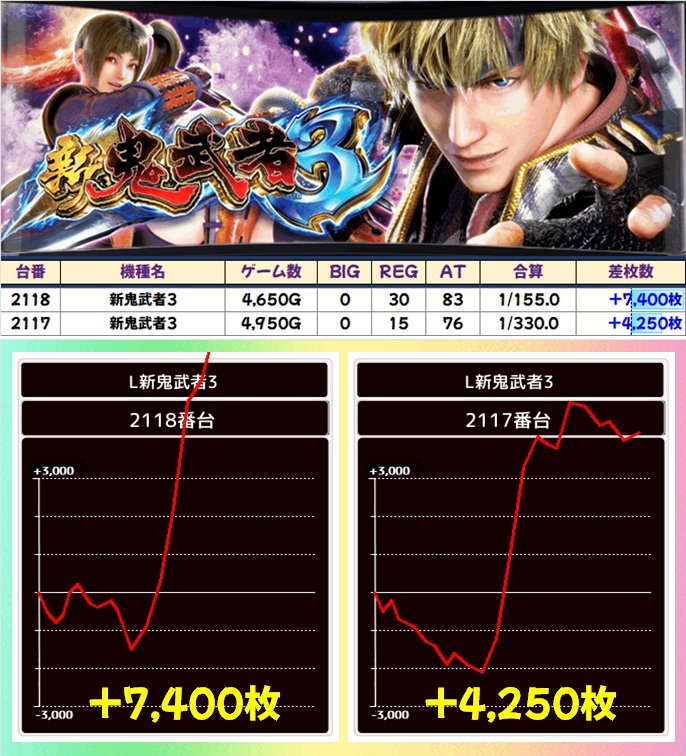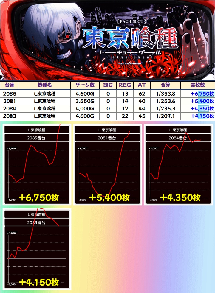 特に「L東京喰種」は全台+4000枚以上で平均+5083枚、「新鬼武者3」は+7400枚を筆頭に全台プラスで平均+3983枚と大爆発!