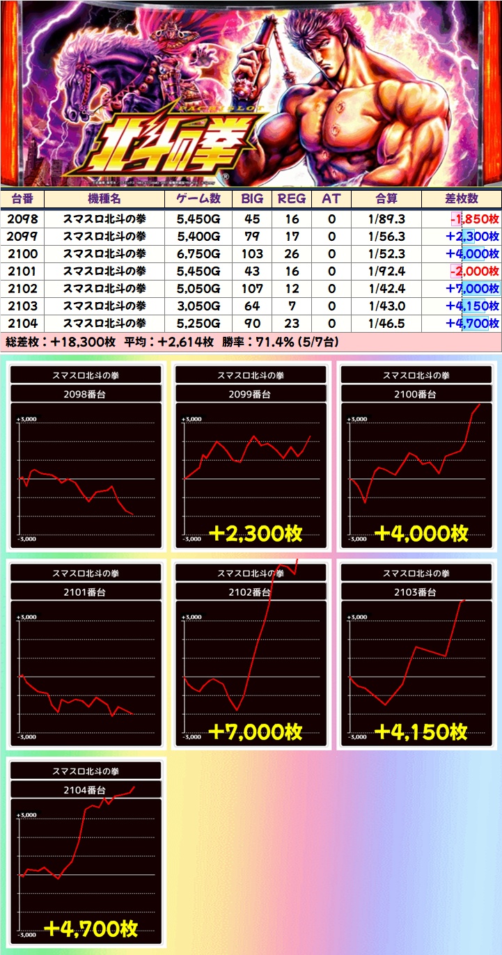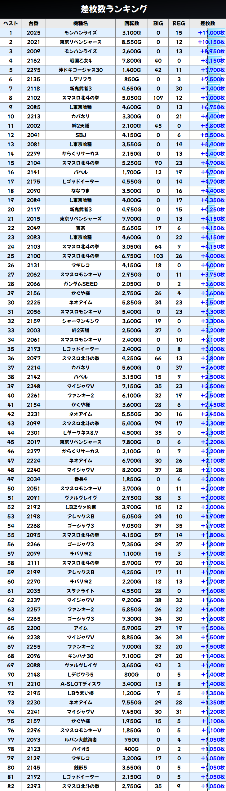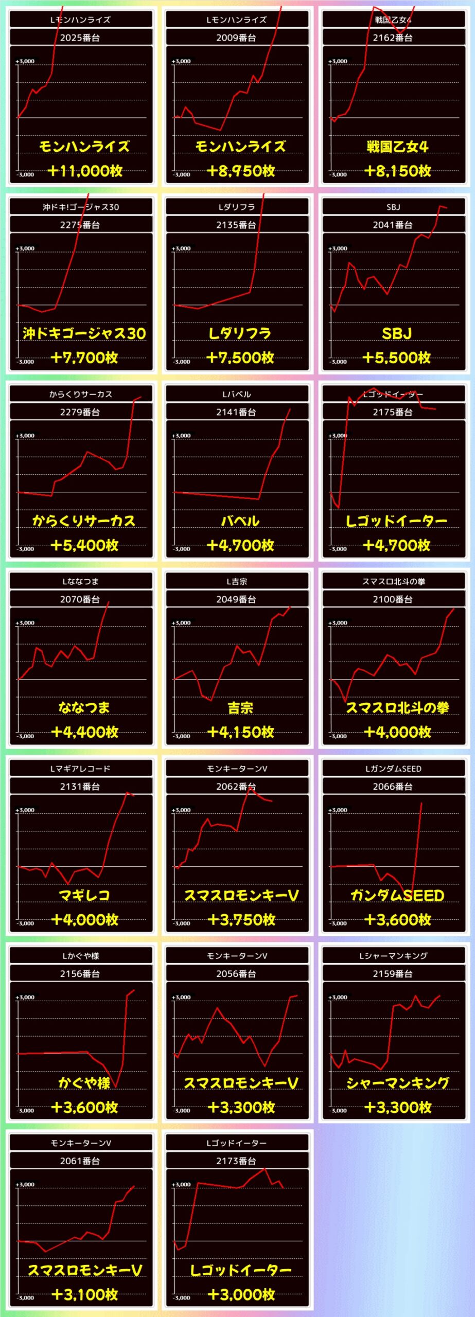 +7000枚を筆頭に半数以上が4000枚を突破! 不発台もしっかり稼働しているので高設定示唆などが出ていたかなと!